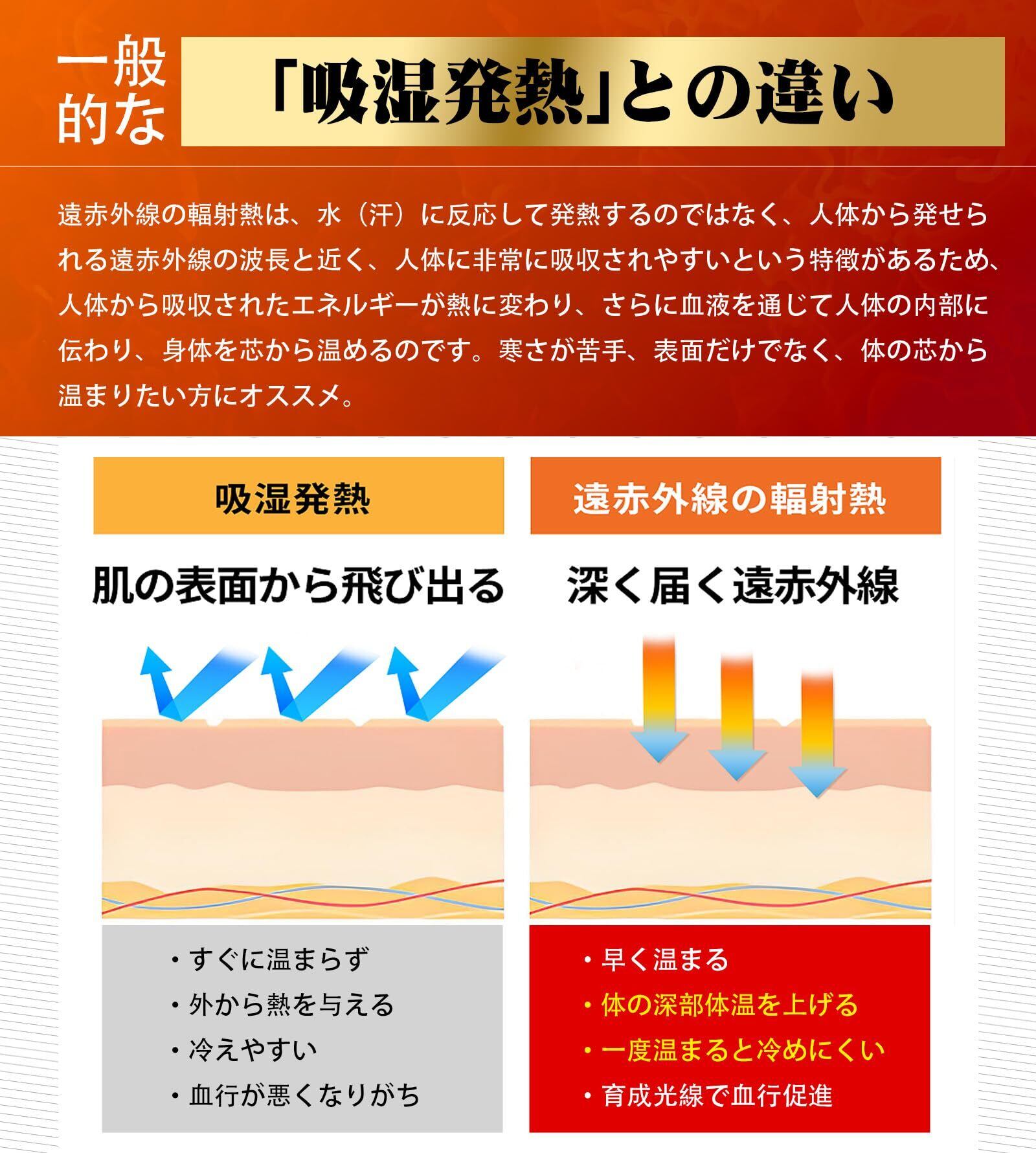 【従来の「吸湿発熱毛布」との違い】吸湿発熱繊維を採用した暖かい毛布は、水(汗)に反応して発熱するのですが、汗をかかないと暖かくならないため、使用直後に暖かさを感じにくかったり熱すぎてムレたりすることが多いです。その反面、遠赤発熱毛布は、自分の体温で体を温めるので、早く温まるのと、身体の内側まで温まったり、一度温まると冷えにくいのが大きな特長です。寒さが苦手で、なかなか寝付けない/表面だけでなく、体の芯から温まりたい/血行促進で、朝まで快適な睡眠を求めている方にオススメです。さらに注目すべくのは、遠赤外線に水分蒸発を助ける働きがあることです。W極のあったか毛布は発汗による湿度の上昇を抑え、睡眠中の体温変化や発汗による蒸れを軽減。温度と湿度を快適なバランスで保ってくれます。冬でも汗かきさんの寝汗、汗臭問題を解決。睡眠環境の質向上をサポートします。