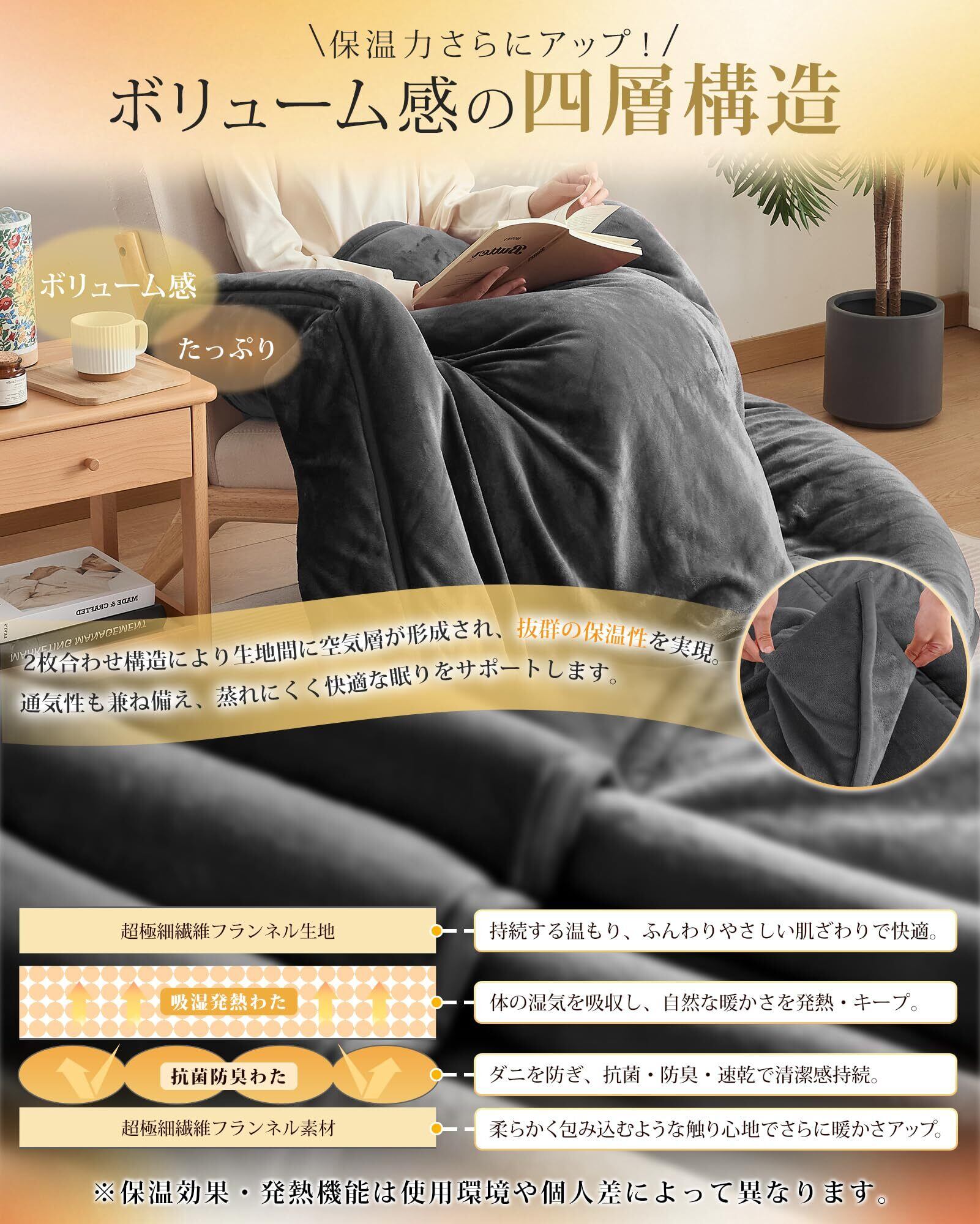 極厚の四層構造により、蓄熱断熱素材が体温を逃がさず、すぐにポカポカ感を実感できます。特に寒い日でも安心して使用できるため、寝る時はもちろん、リビングでのリラックスタイムにも大活躍です。