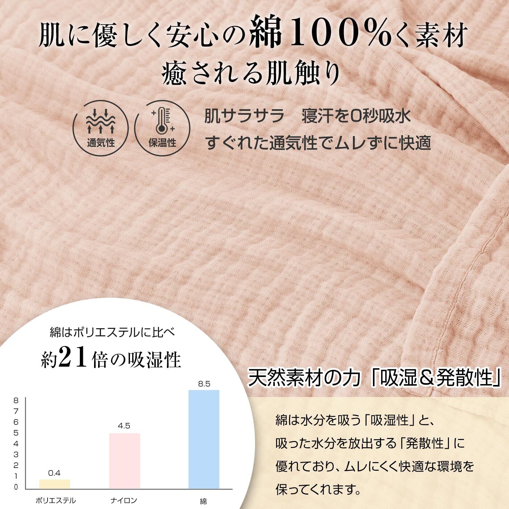 このガーゼケットは抗菌・防臭効果があり、常に清潔な状態でご使用いただけます。肌に優しい綿素材は敏感肌の方にも最適で、やさしく包み込んでくれます。シエルピンクの柔らかな色合いは、どんなインテリアにもぴったり合い、お部屋を明るく演出します。