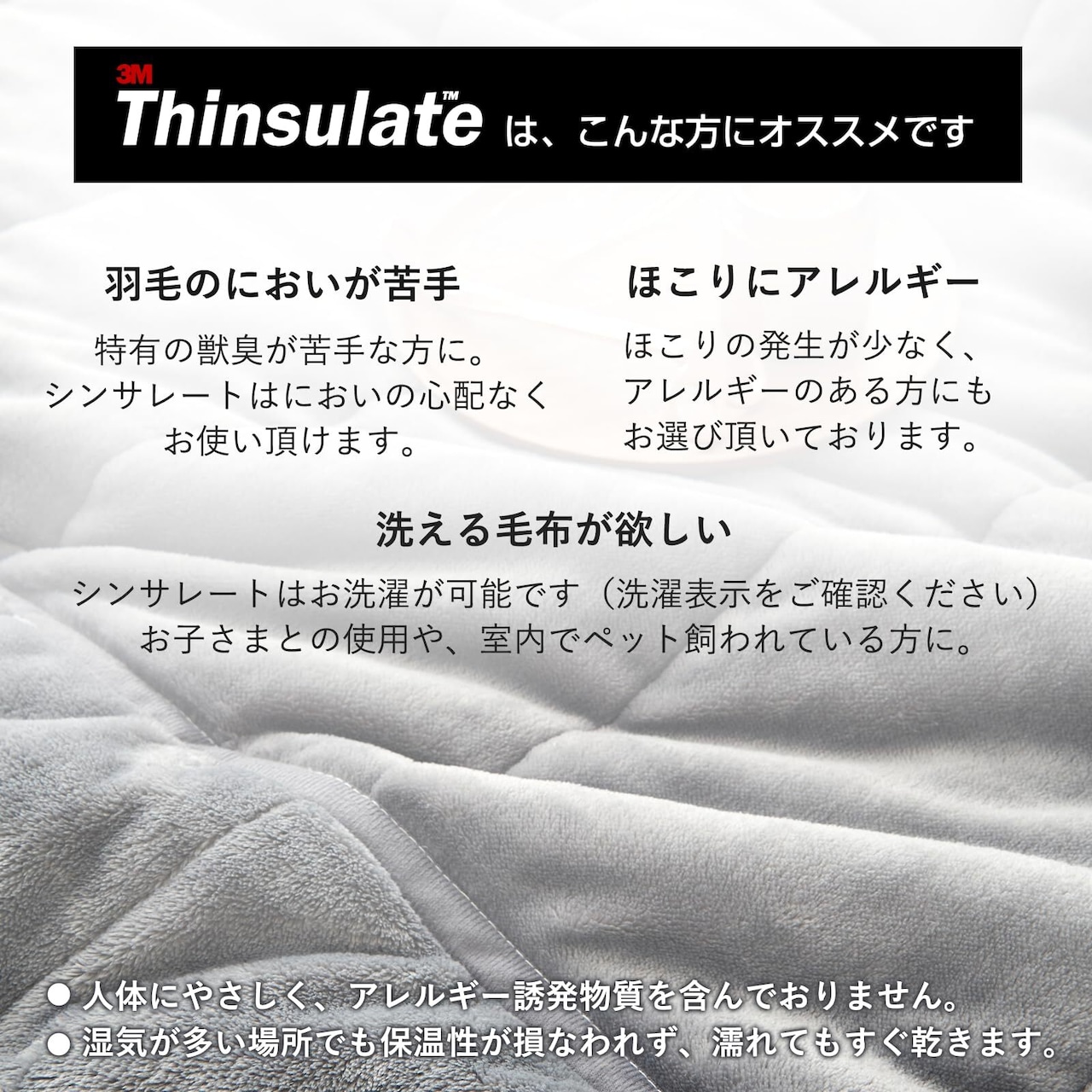 【暖かくて、厚くない】3Mシンサレート高機能中綿素材は、薄くても暖かい断熱素材です。吸水性が10%以下と湿気が多い場所に強く保温性を失いにくいうえ、濡れてもすぐに乾くといった点が強みです。湿気に強いためダニやカビが発生する確率もぐんと低くなります。また羽毛布団と違って化学繊維なので、アレルギーも起こりにくく人体にやさしい素材といえる。
