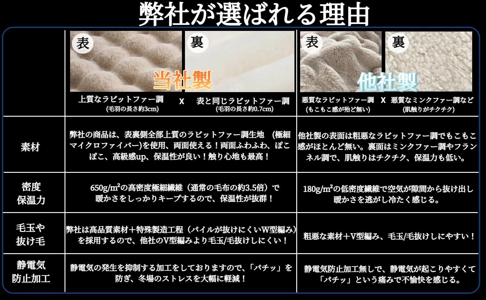 【二枚合わせ毛布】の商品は表裏側とも高品質のラビットファー調生地(表側は長い繊維、内側は短い繊維)を重ねている二枚合わせ毛布です。両面ふわふわ素材で普通の毛布と比べると毛足の長さは約2倍+密度は約3.5倍!