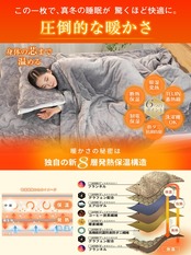 【一晩中持続する暖かさの秘密】は、研究に研究を重ね、こだわりぬいた独自の「新8層発熱保温断熱構造」です。①この瞬温シリーズ冬用あったか毛布の表層には、驚くほどなめらかな肌触りのマイクロファイバーを使用、ふわっと素肌に触れるたびに、極上の気持ちよさにとろけてしまうほど。②生地基布に「遠赤外発熱」「熱伝導性」「蓄熱保温」「抗菌防臭」特性を備えている奇跡のグラフェン素材配合しています。③『贅沢に詰め込んだのは、特別な中わた』の上層には、宇宙服に採用されている次世代断熱材『エアロゲル』層×「吸湿発熱」「蓄熱保温」「遠赤外発熱」「永久消臭」の特性を持ち、環境にもやさしい素材『コーヒー炭素繊維』を採用、中わたの下層には天然ショウガ成分配合の吸湿発熱新素材『暖姜繊維』と高機能抗菌防臭防ダニ繊維を採用しています。④「吸湿発熱」×「遠赤外線発熱」のわたが、寝ている間の汗を吸って暖かさに変え、しかもムレにくくなっているので、より保温性が高くなっています。圧倒的な暖かさを効率よく毛布全体に伝えて循環させるから、寒い冬でもあたたかさが保てます。