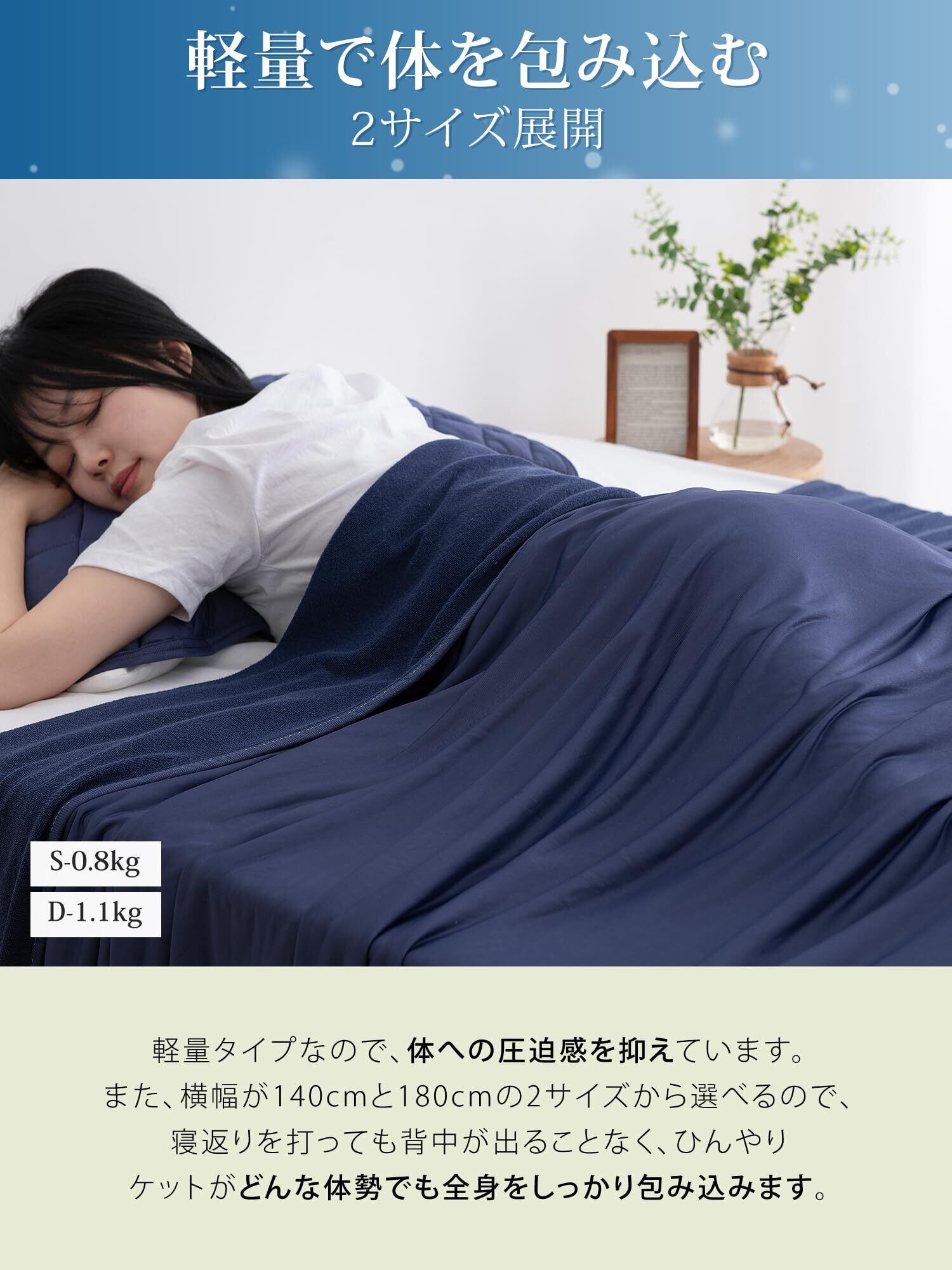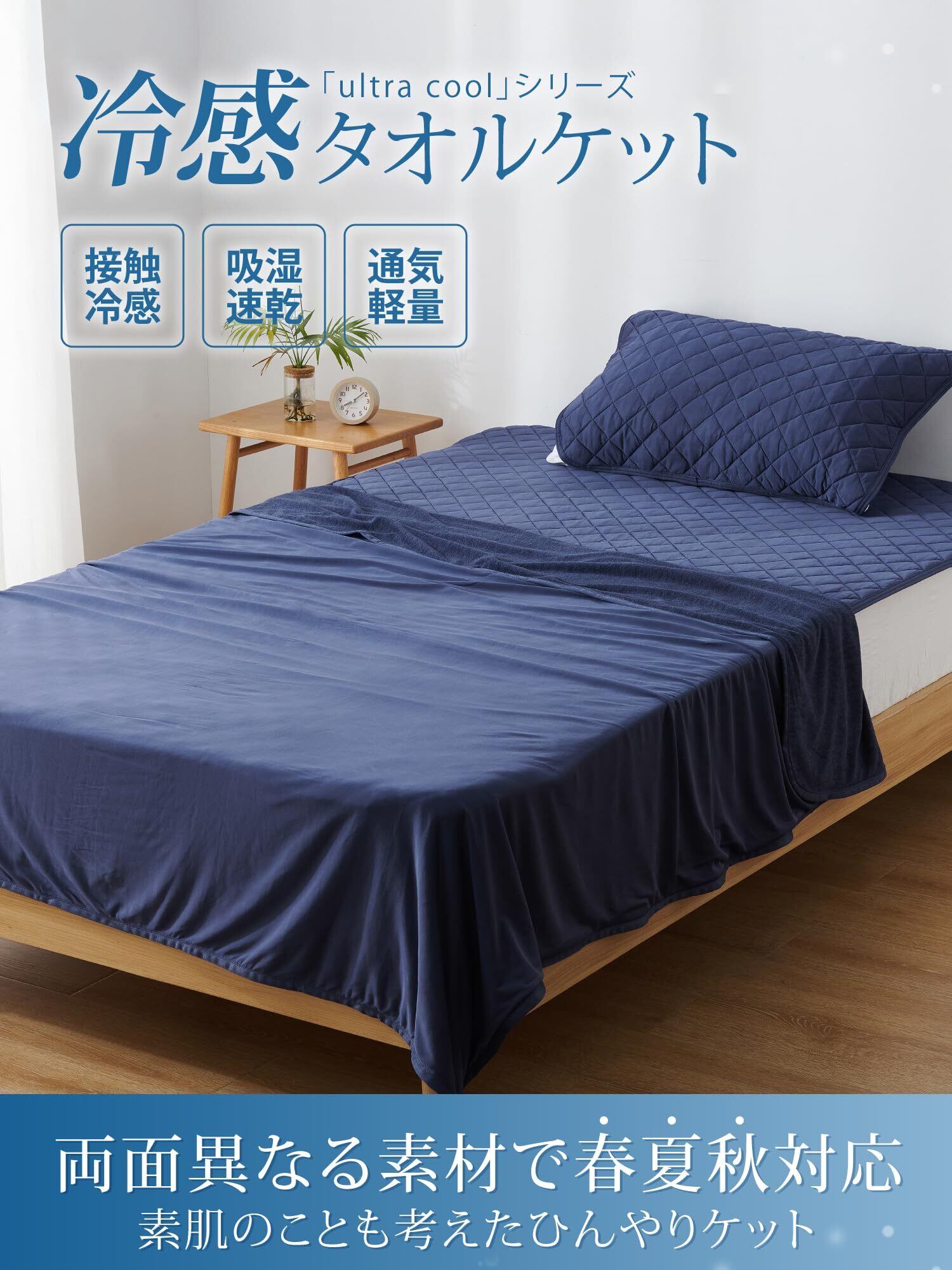 このタオルケットはシングルサイズの約140×190cmで、涼しげなネイビーカラーが落ち着いた雰囲気を演出。接触冷感素材を使用しており、寝入る瞬間から体温を優しくキープ。さらっとした肌触りで、暑い季節でも快適な睡眠をサポートします。