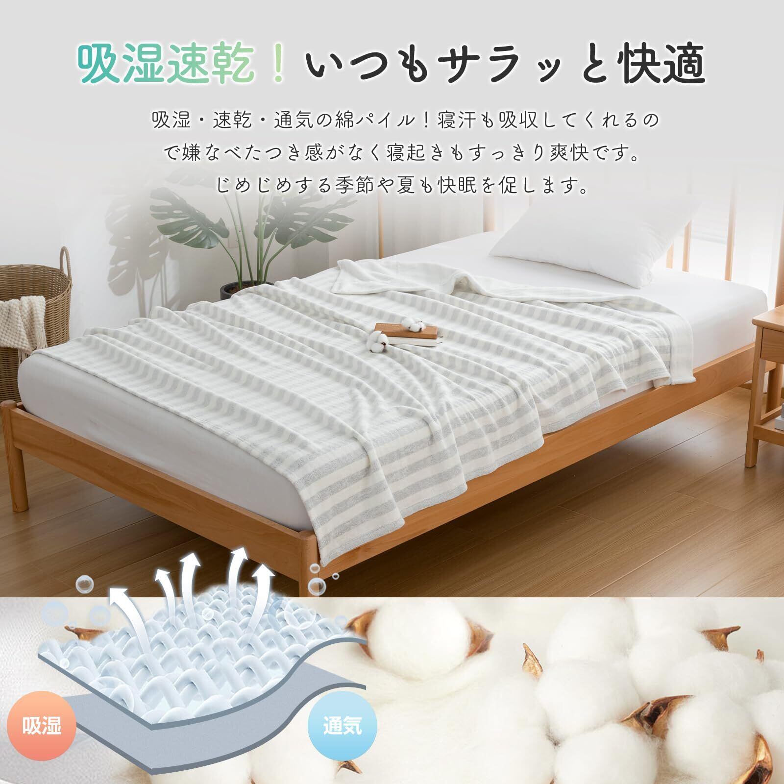 【いつもサラッと快適・ 吸湿速乾】吸水性・吸湿性に優れたタオルケットは、汗や湿気を素早くしっかりと吸収してくれます。梅雨のジメジメでも夏のムシムシでも、サラッとしてベタつきにくく、朝までぐっすり眠り、寝起きも爽快です。ほどよい厚みで暑いとは感じてません、癒されるふわっとした肌触りが気持ちいいです。