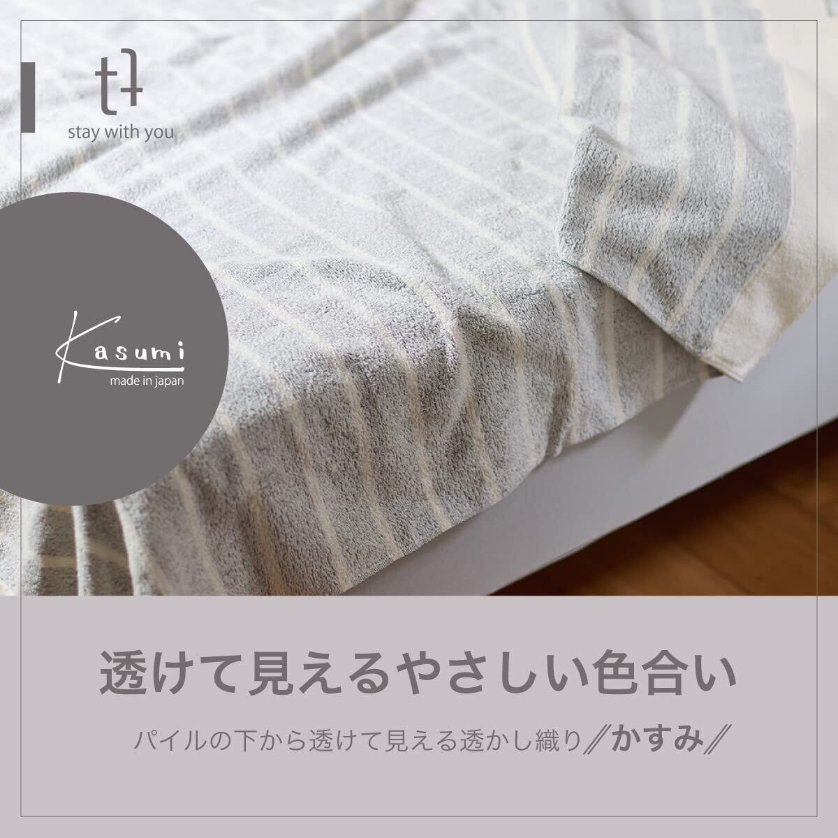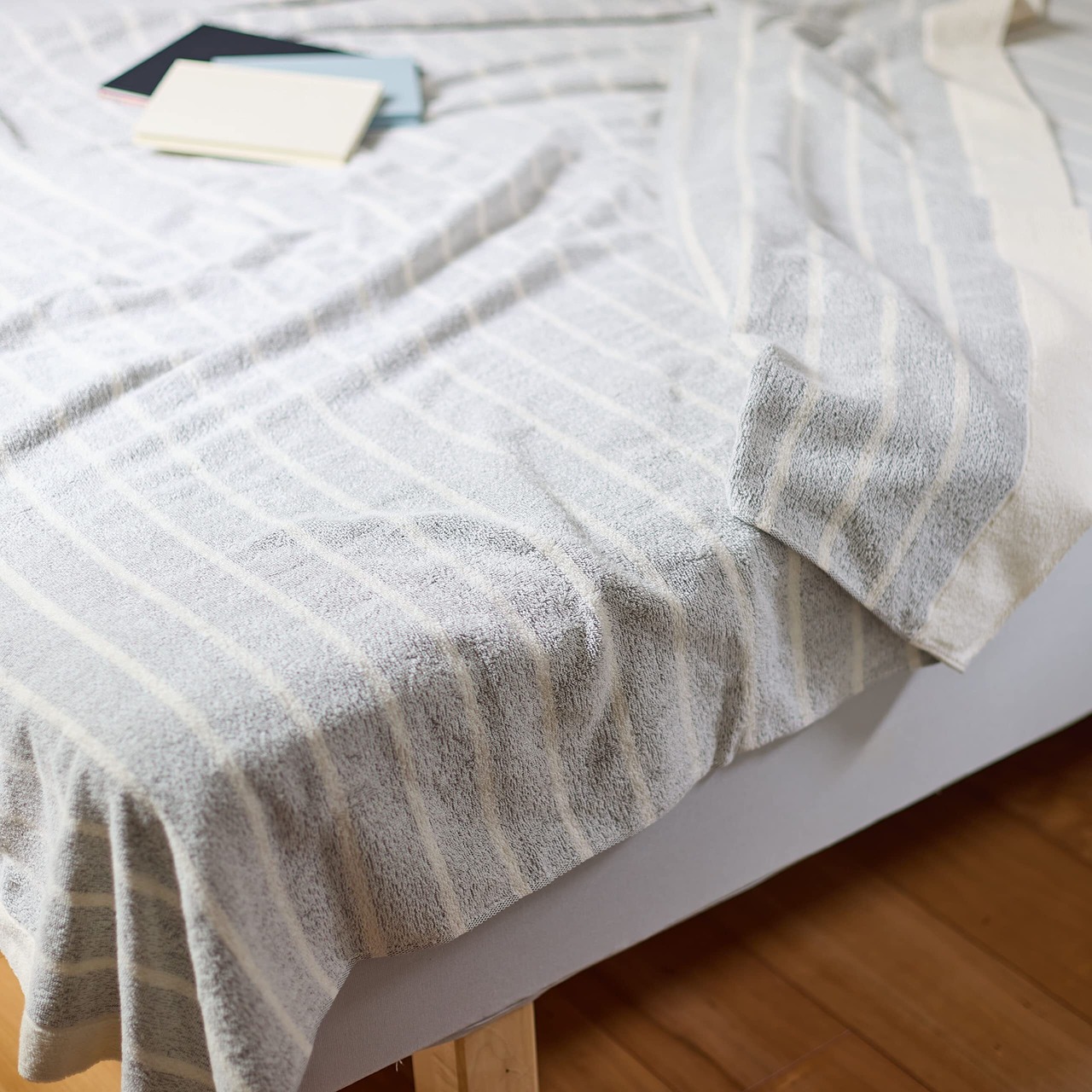 【透かし織のかすみ】パイルの下から柄が透けて見える透かし織を採用。主張しすぎないボーダー柄のパイル生地はインテリアに合わせやすいデザイン。栽培からこだわったオーガニックコットンをパイル部分に使用しており、天然素材のタオルケットならではの優しい肌触りが感じられます。