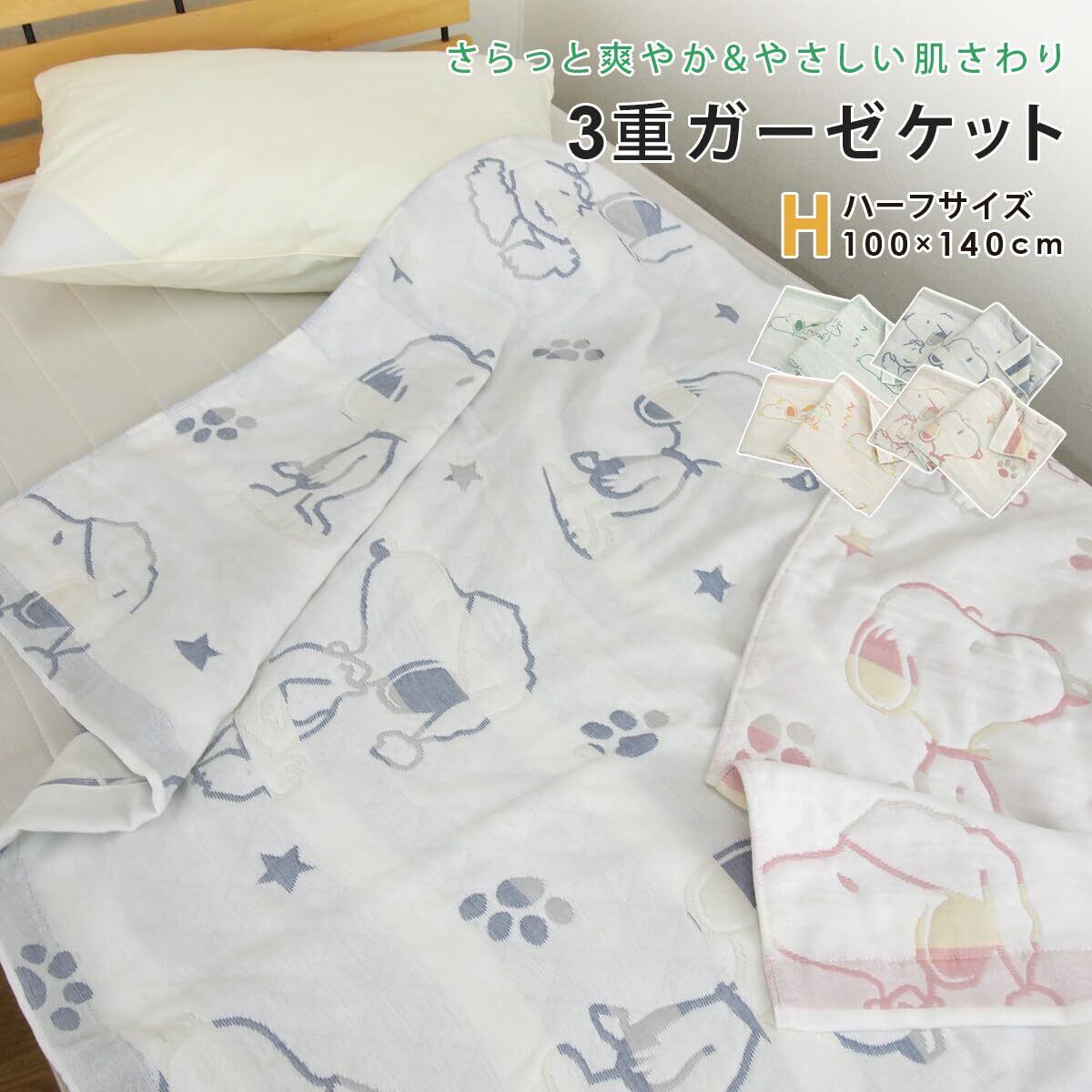 さらっと優しい肌触りの3重ガーゼケット/スヌーピーのかわいいデザイン。お子様のジュニアケットにもピッタリなハーフサイズ。