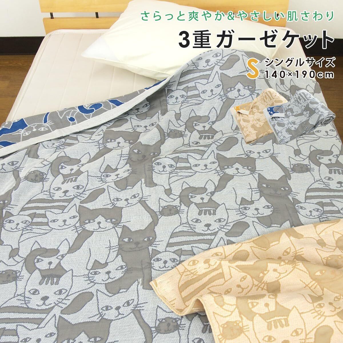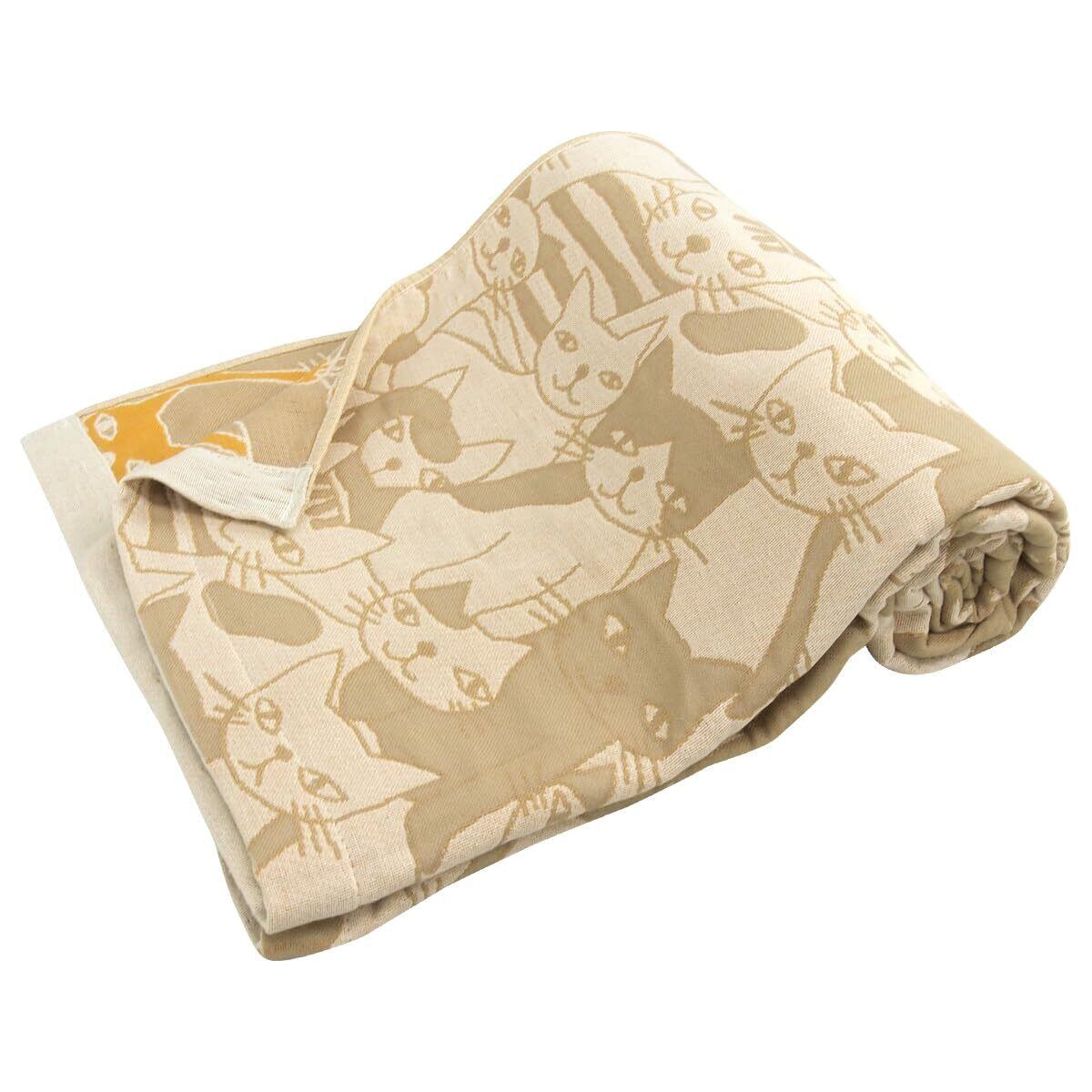 リヴェール ガーゼケット 3重ガーゼ シングル 猫柄 洗える ブランケット タオルケット 冷房対策 夏用 綿混 (イエロー)