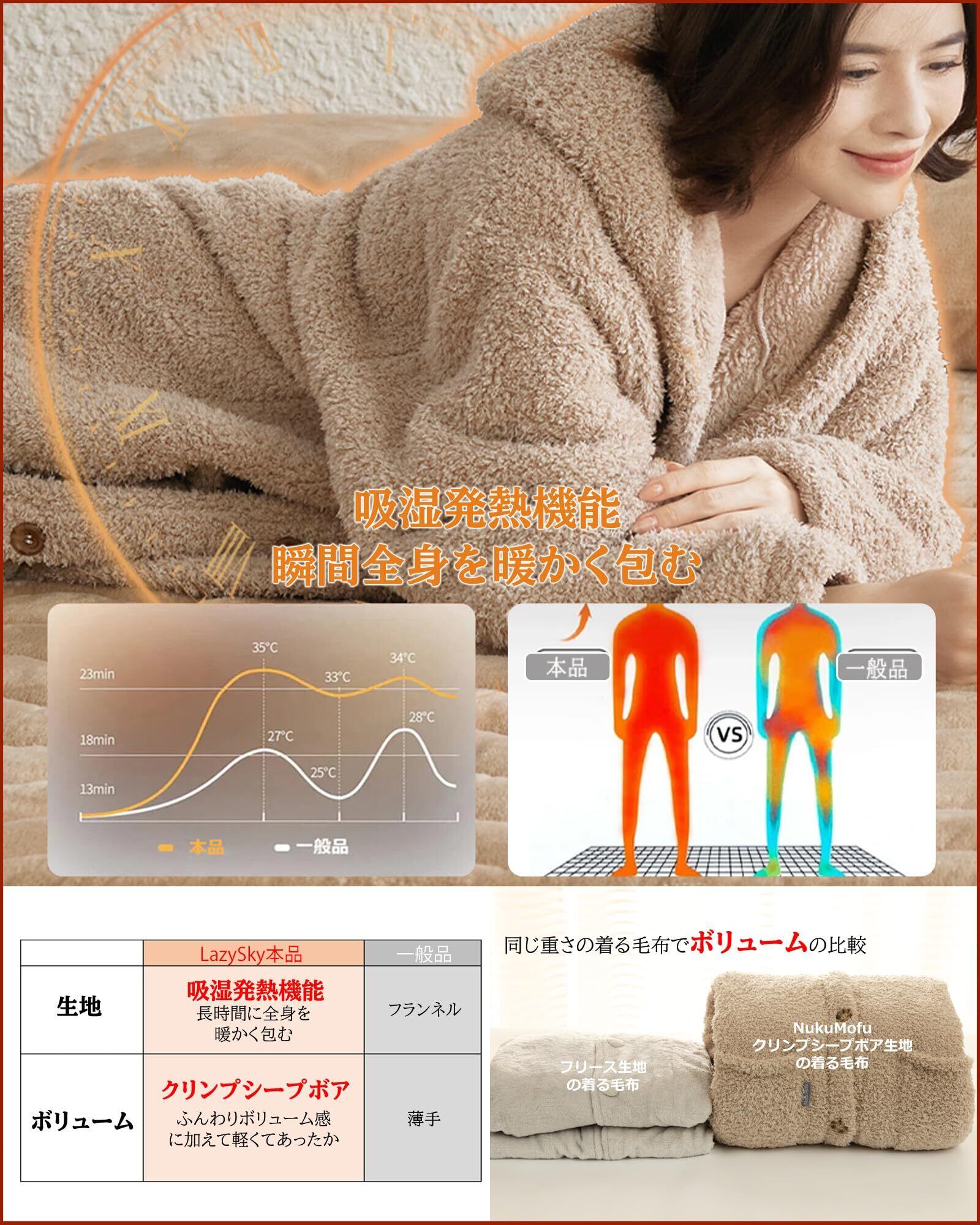 【プラス2.5℃圧倒的な保温性】当社独自のクリンプシープボア生地を使用、抜群の吸湿発熱効果と、しっとりで滑らかな肌触りを兼ね備え、まるで毛布に包まれているような安心感を提供します。保温性は普通のフランネル生地の商品よりプラス2.5℃!冬の季節にぴったりなぬくぬく着る毛布です。【着ればすぐにポカポカ】着る毛布は吸湿発熱の素材を使用しているので汗や湿気を熱に変えて保温性が高く、暖かさをしっかりキープできます。暖房をつけなくても過ごせる日が増えます。ゆったりサイズなので男女兼用で着用できます。家族みんなで使えば、暖房を付けずに過ごせる日が増えて電気代の節約にも繋がります。つい、うたた寝しちゃっても大丈夫です。【一秒で恋するもこもこ柔らかな新触感】やみつきになるふわふわ柔らかな肌触りを実感できます。肌寒さを感じるようなとき、さっと羽織って寒さをしのげて、ずっと触れていたくなるほわほわモコモコ感!