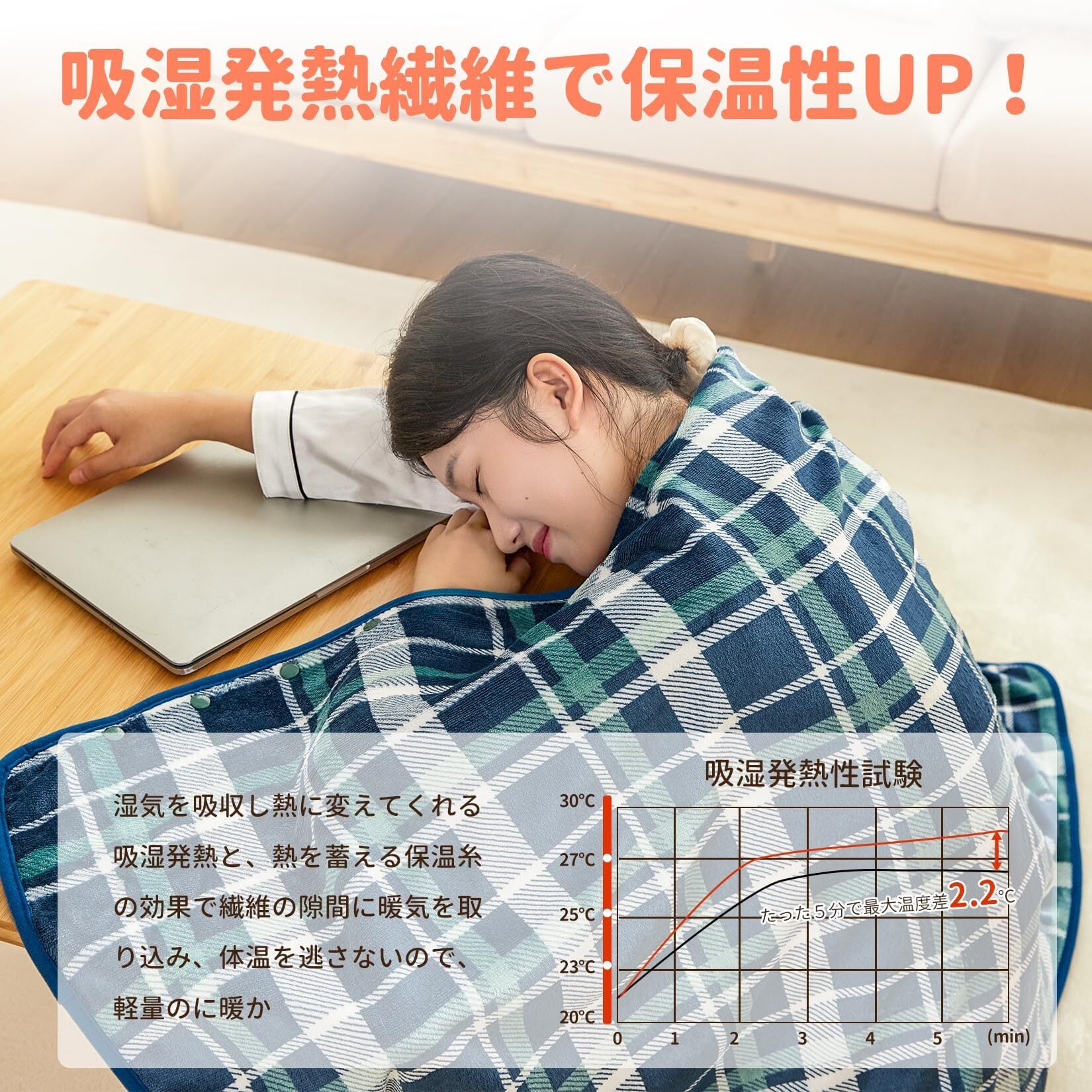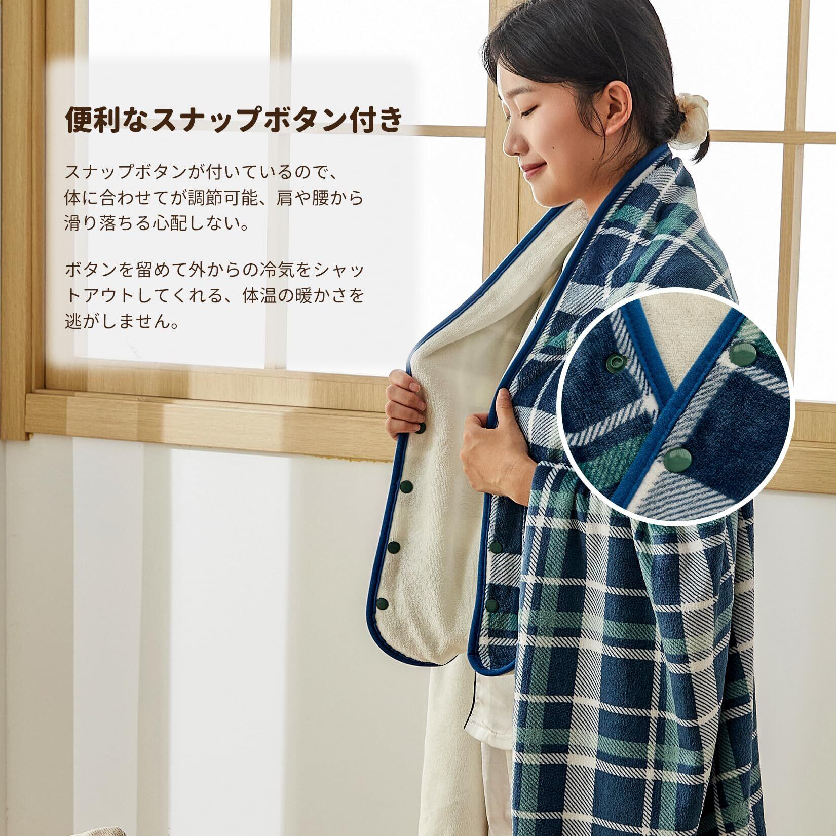 大判サイズである100×140cmは、体をしっかりと包み込むことができ、特に寒がりの方も安心してご使用いただけます。ボタン付きで、肩や腰にしっかりとフィットし、動きやすいデザインを実現しています。防寒対策に優れた、冬に欠かせないアイテムです。