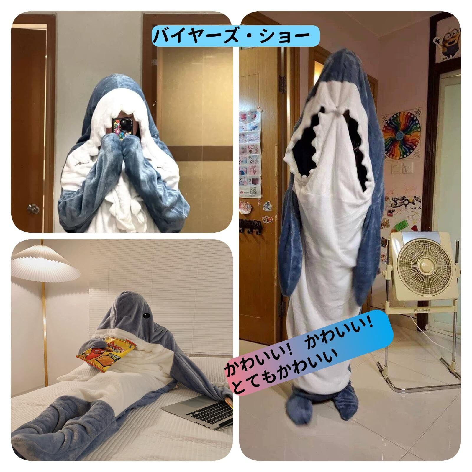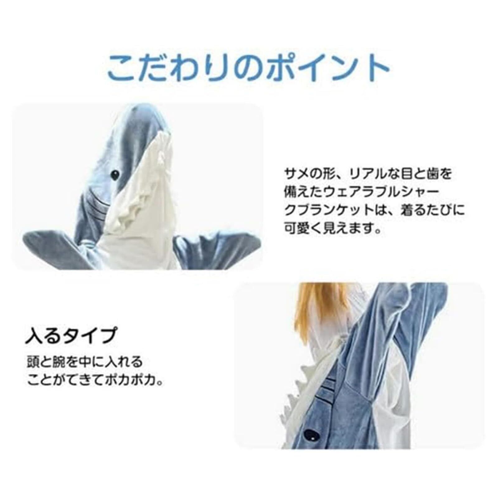 「ユニークで可愛いデザインの[AOOKK] サメ寝袋で、みんなの注目を集めちゃいましょう!このサメの着ぐるみは、110-180cmに対応した大人用もあり、子供も楽しめる仕様となっています。」