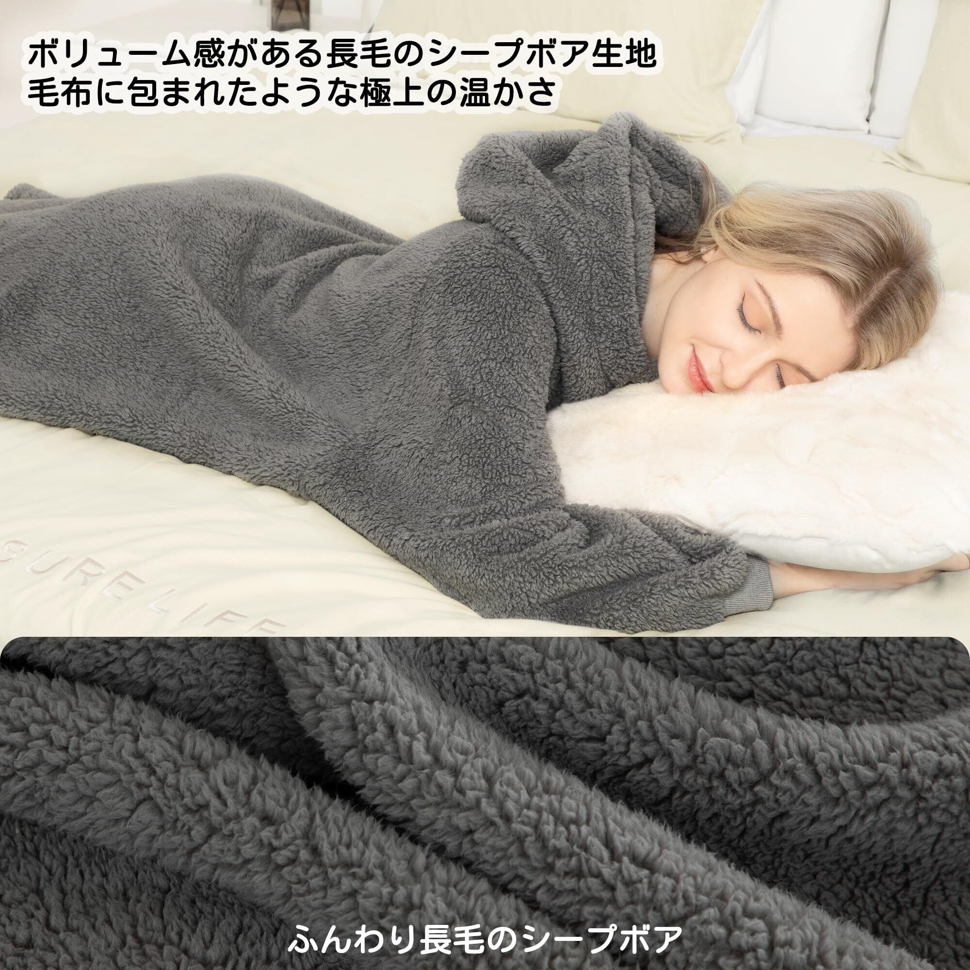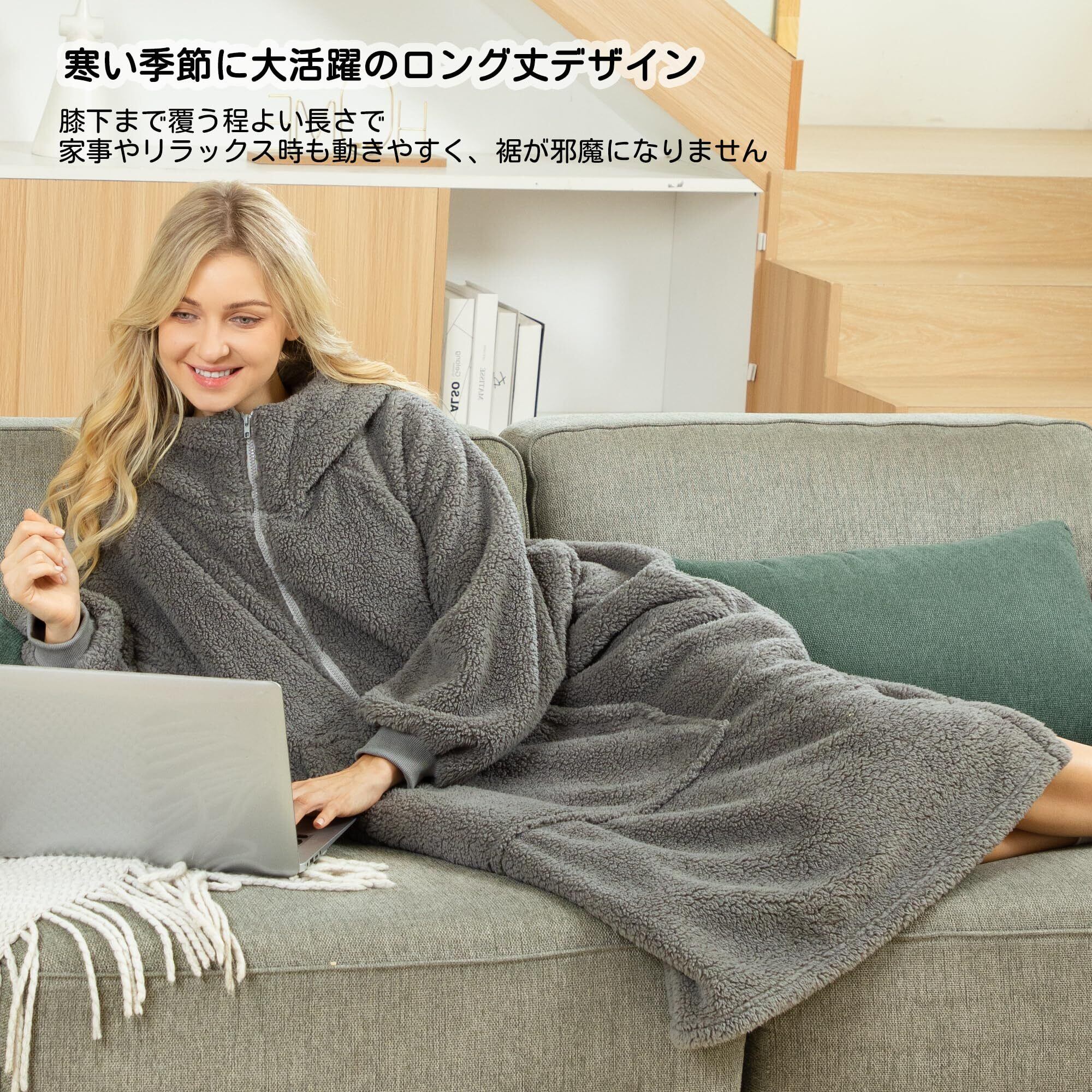 [Winthome] 着る毛布 ロング丈 ルームウェア ジッパー付き 部屋着 全身カバー ゲーミング 裏起毛シープボア もこもこ 軽量 保温 フード ポケット付 ガウン 大きいサイズ 防寒対策 エコ メンズ レディース
