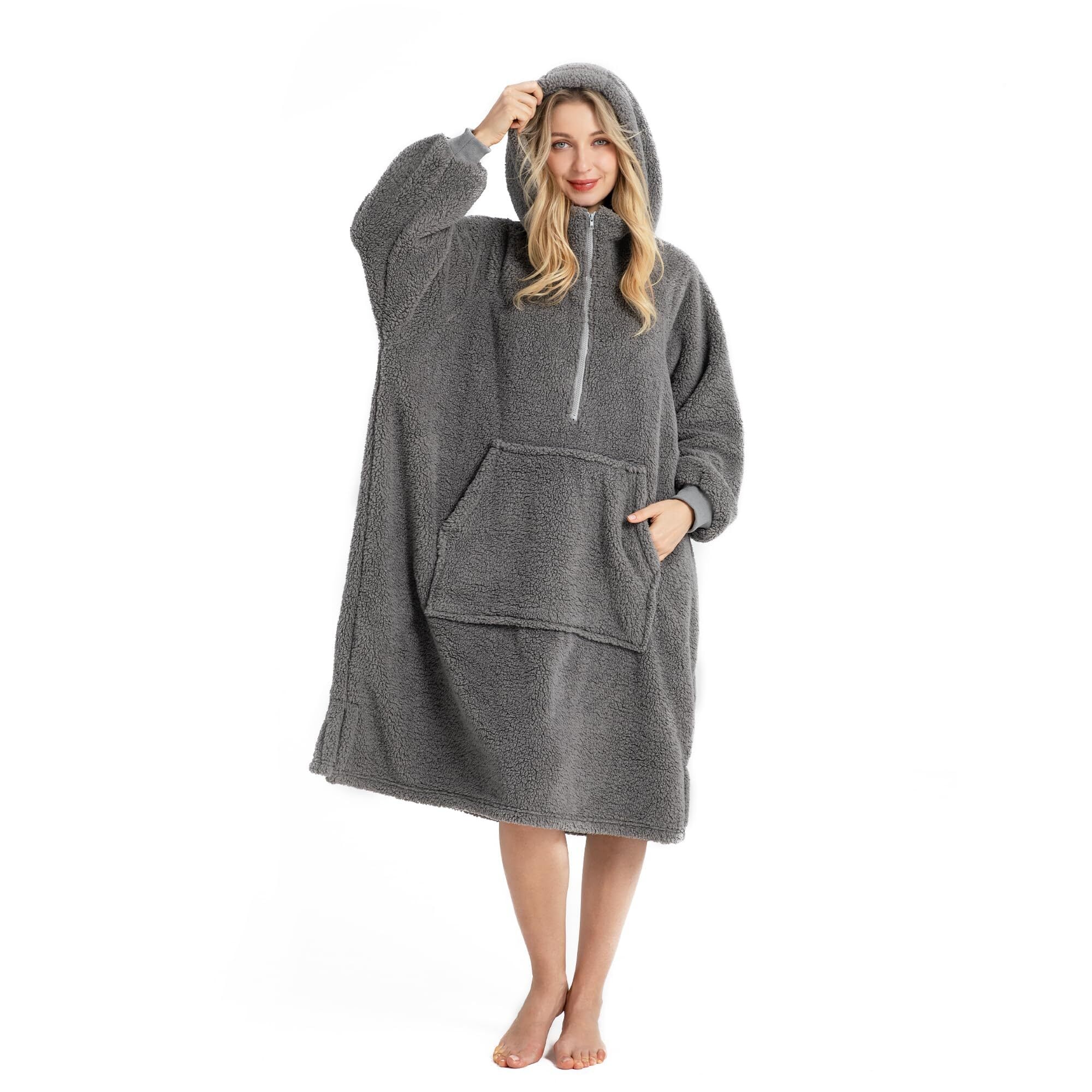 【在庫処分】[Winthome] 着る毛布 ロング丈 ルームウェア ジッパー付き 部屋着 全身カバー ゲーミング 裏起毛シープボア もこもこ 軽量 保温 フード ポケット付 ガウン 大きいサイズ 防寒対策 エコ メンズ レディース