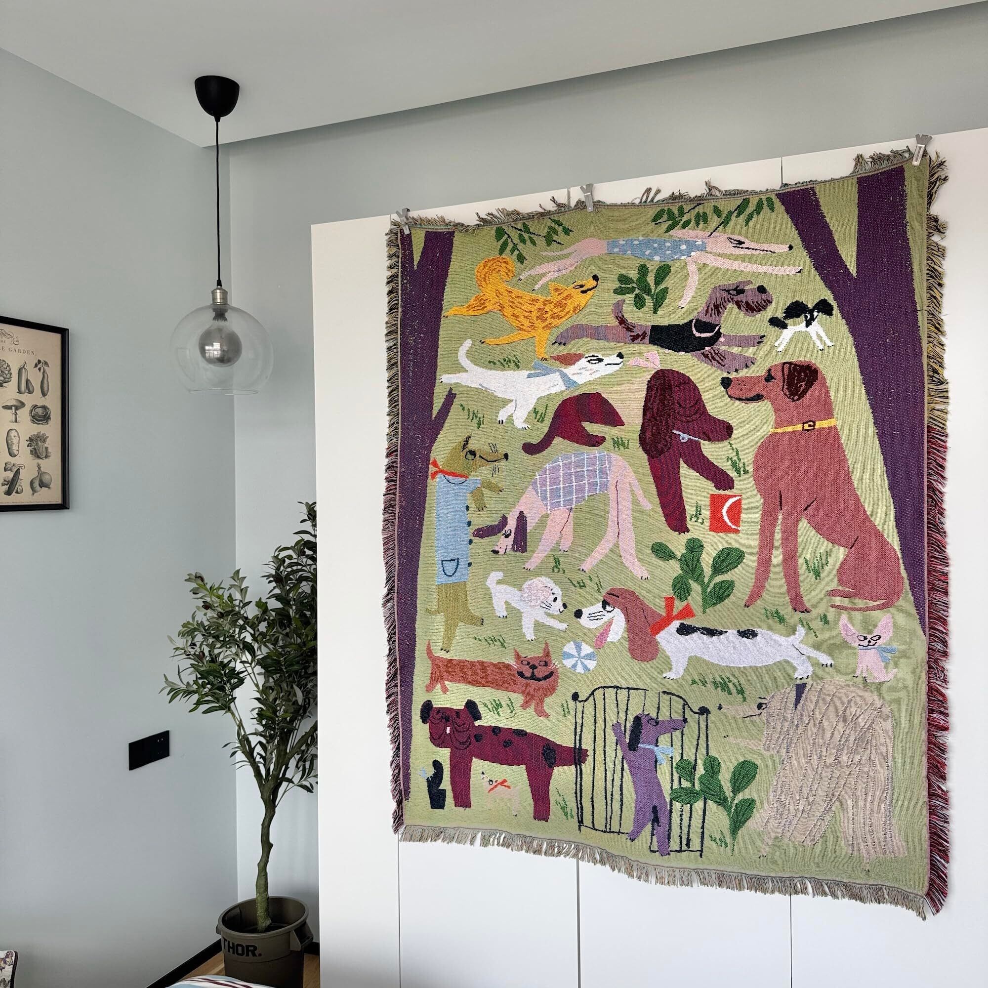 「心温まる北欧風の犬柄デザインが光る、Dog Parkのマルチカバーがあなたのお部屋を明るく彩ります!サイズは130cm×160cmで、リビングやベッドルームに最適なアイテムです。」