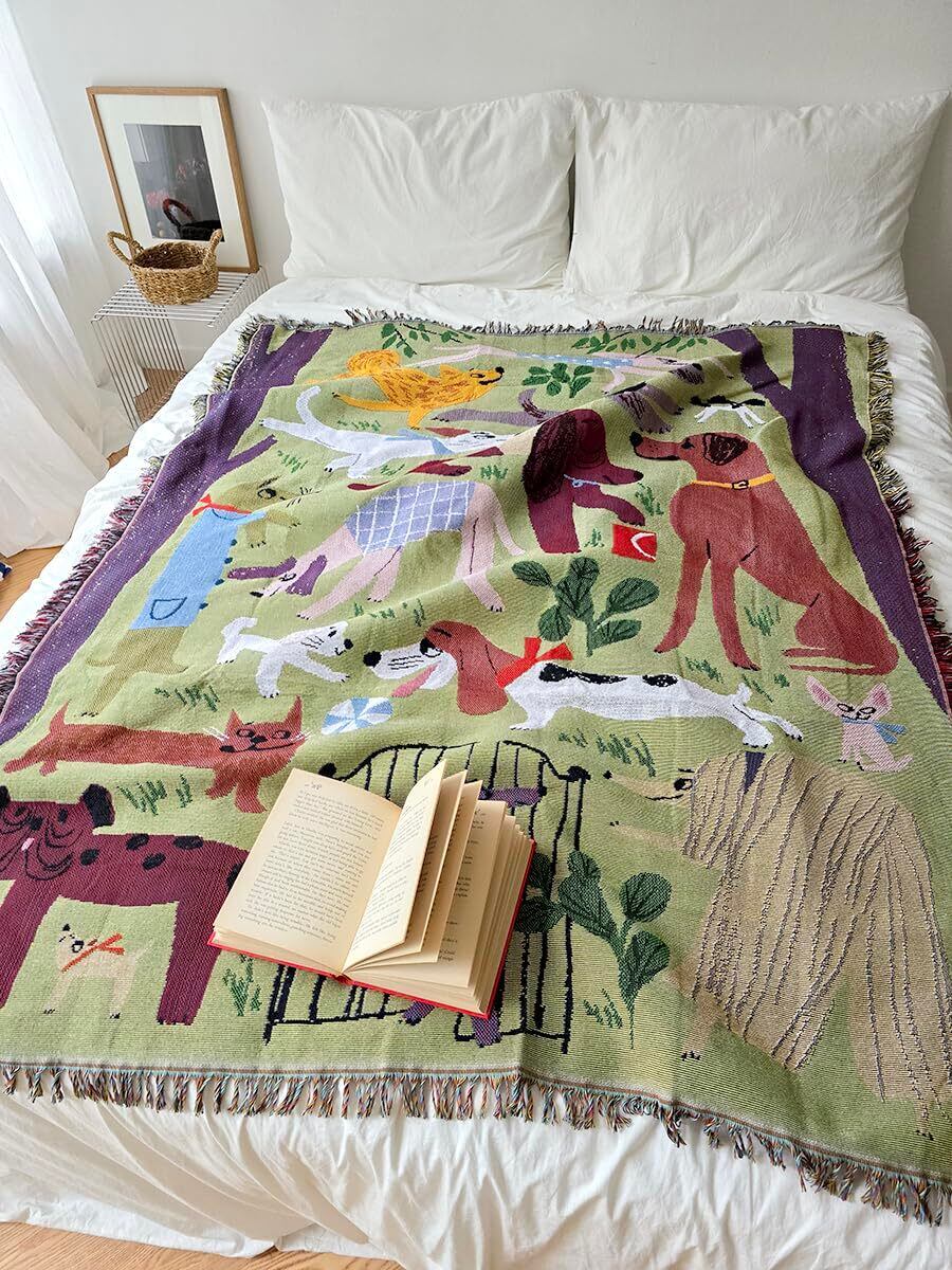 \【数量限定】Dog Park 北欧風 犬柄, グリーン, 韓国風のインテリア おしゃれ マルチカバー ブランケット ,ソファーカバー, 洗濯可能, ベッドカバー (130X160cm)/