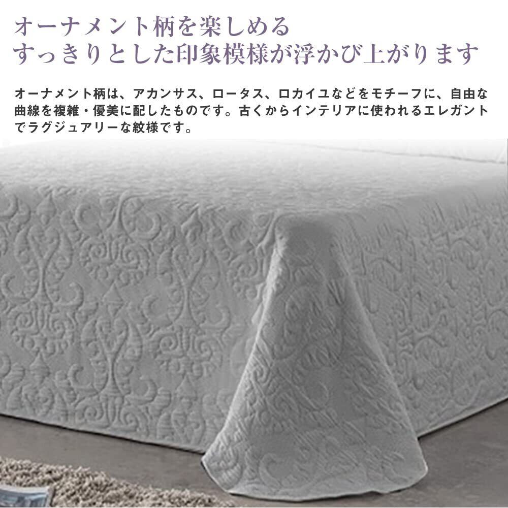 このベッドカバーには、豪華なダマスク模様が施されており、おしゃれで洗練された印象を与えます。スペイン製の高品質な素材が使用されており、色褪せしにくく、長くご愛用いただけるアイテムです。肌触りも柔らかく、快適な睡眠をサポートします。
