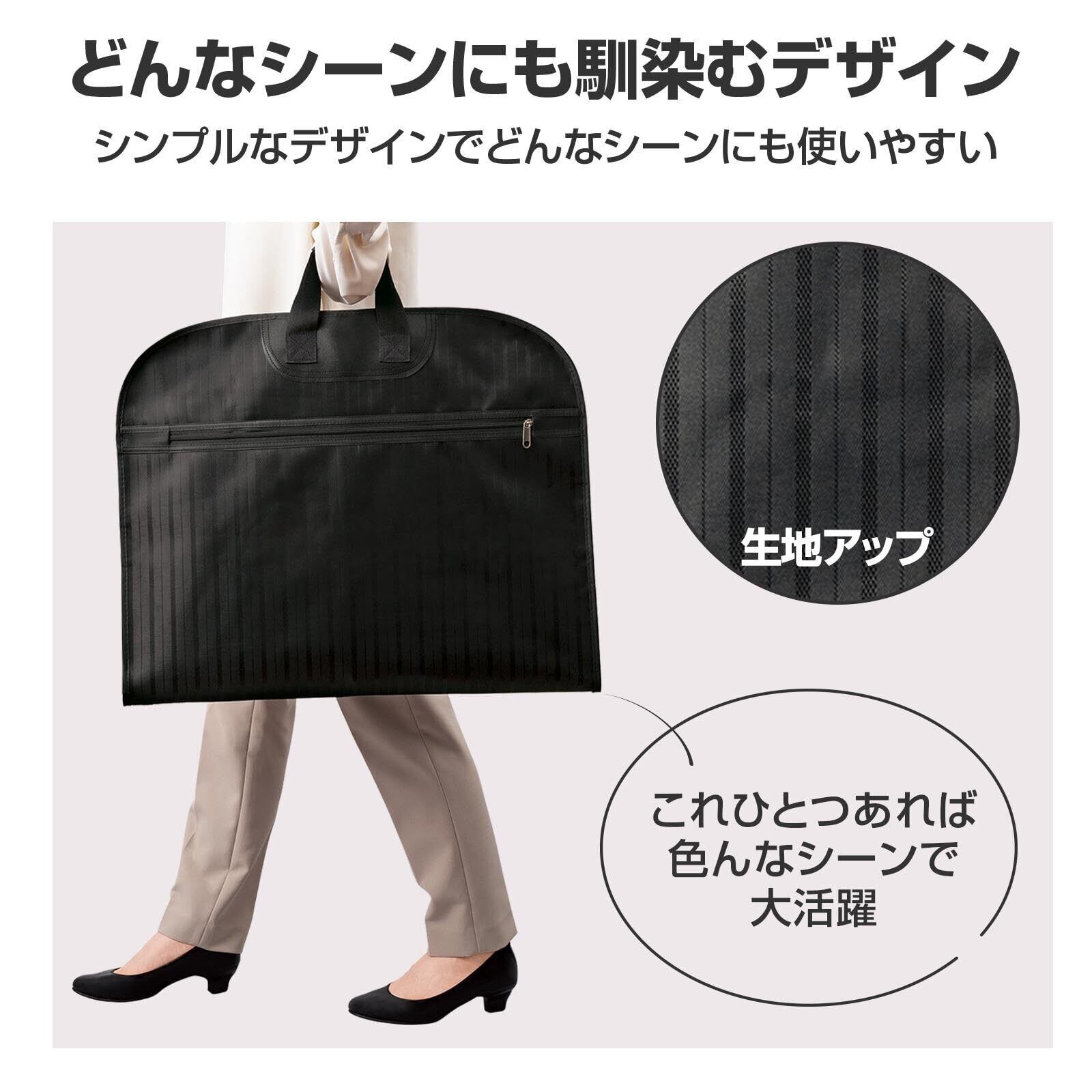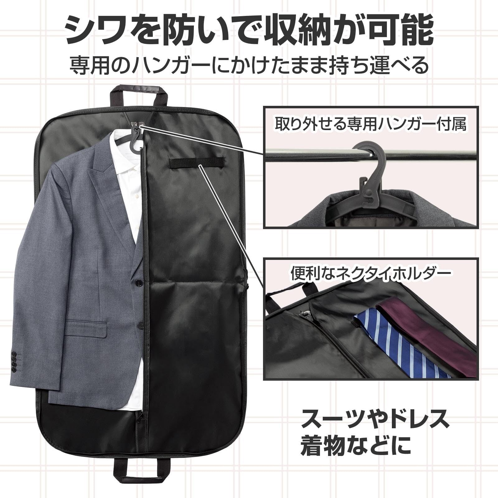 ハンガーが付属しており、スーツやドレスをそのままかけて持ち運ぶことができます。手提げとショルダーストラップの2way仕様で、用途に応じて使い分けが可能です。出張や旅行、日常の通勤にも大活躍します。