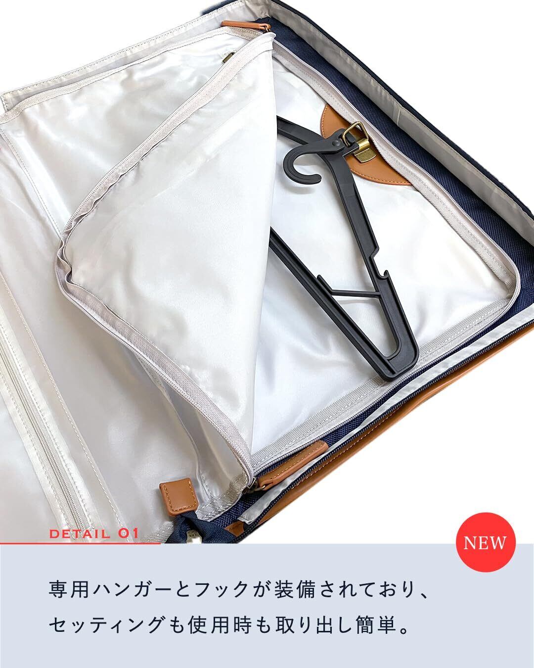 こちらのガーメントバッグは、スーツや礼服をそのままハンガーにかけて収納できる設計です。忙しい出張や冠婚葬祭の際にも、衣類をしっかり保護しながら持ち運べます。