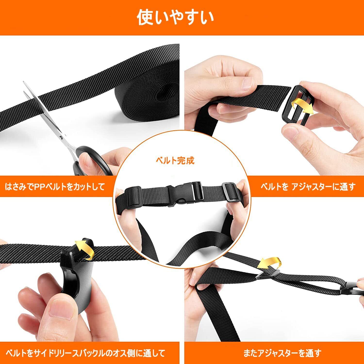 【丈夫で耐久性が高い】サイドリリースバックルとベルト送りはブラスチック製、頑丈でしっかりベルトと止ます。ベルトはポリプロピレン糸を織物にしたのがPPベルトです。繊維としては軽い糸で、まだ織り方は平織で耐久性が高いです。