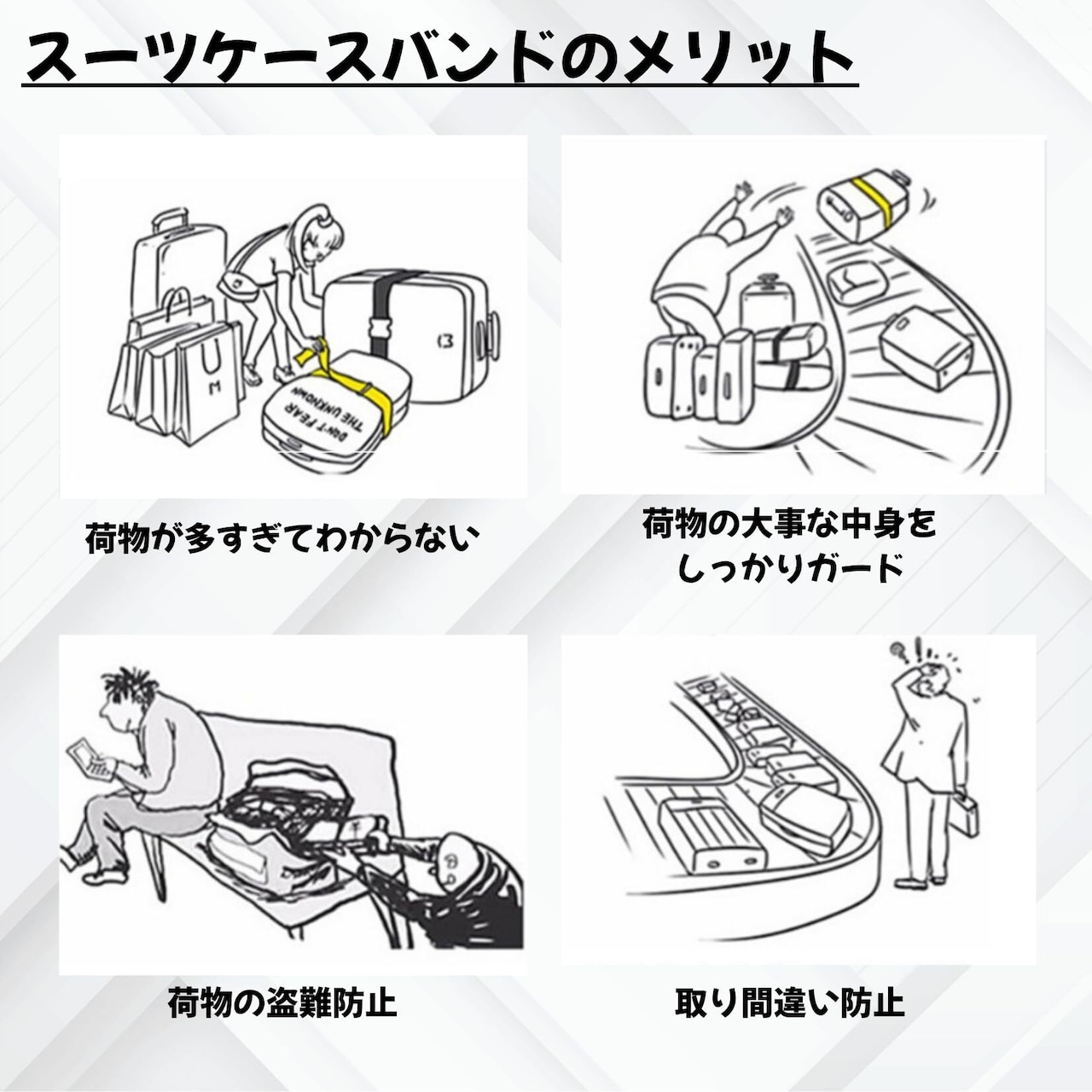 このベルトは、調整可能な設計になっており、さまざまなサイズの荷物にフィットします。スーツケースやボストンバッグなど幅広い種類の荷物をしっかりと固定し、移動中の荷崩れや紛失を防ぎます。安心して旅行を楽しむための頼もしいサポートです。