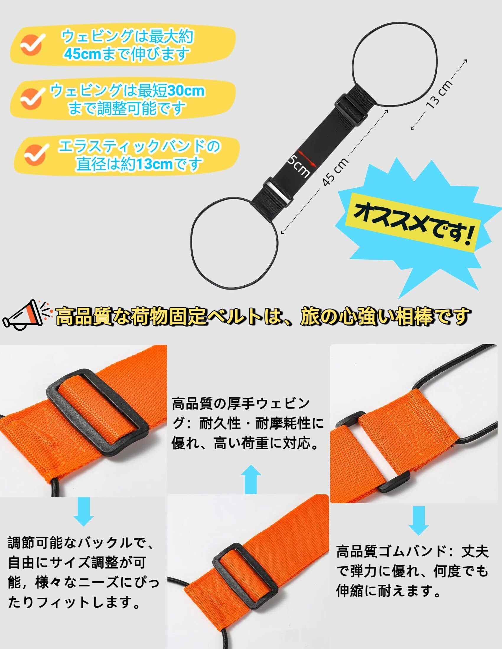 この固定ベルトは、高品質の弾力性素材を使用し、荷物をしっかりとホールドします。リュックやスーツケースに簡単に装着でき、移動中の荷物のずり落ちを防ぎます。ストレスのない旅行をサポートします!