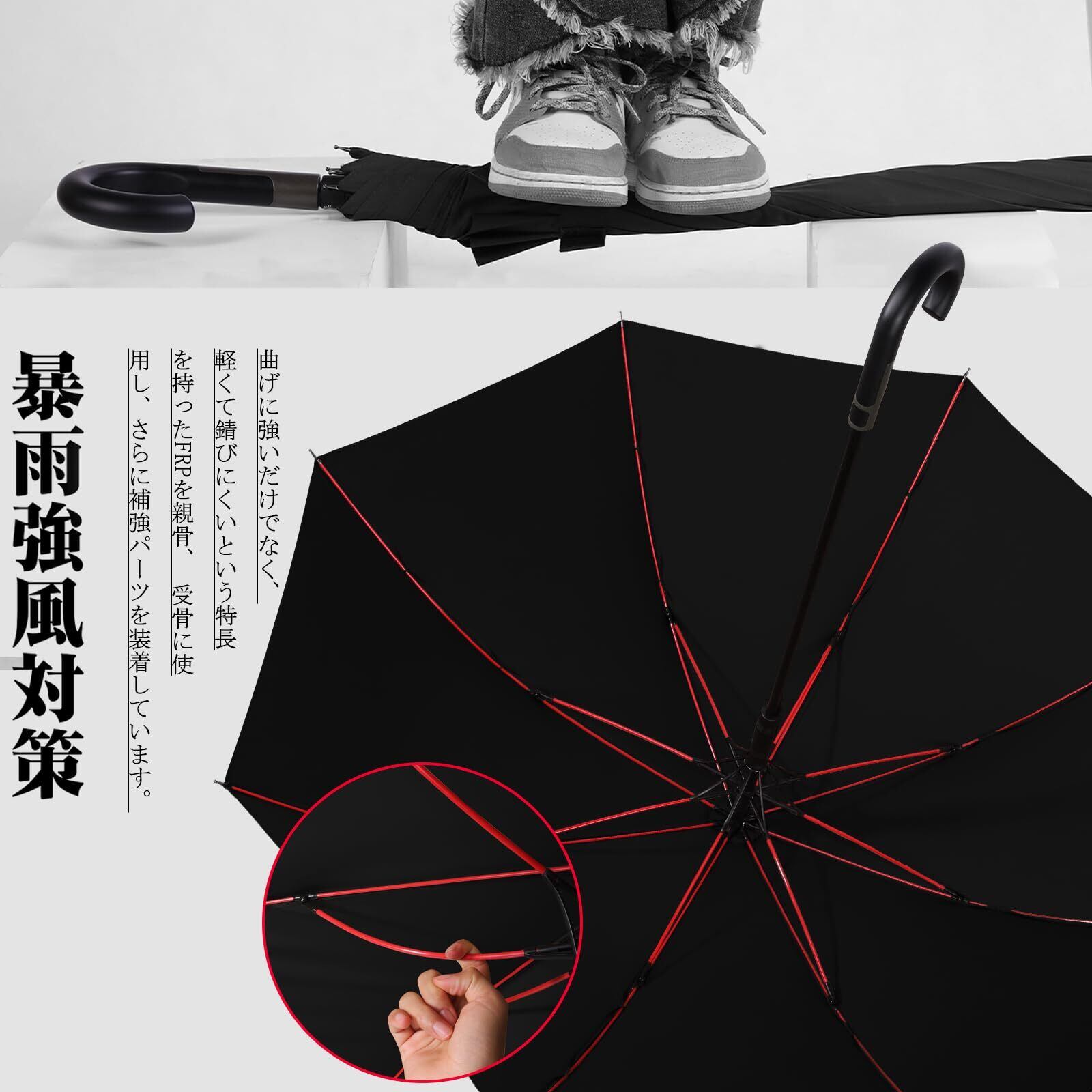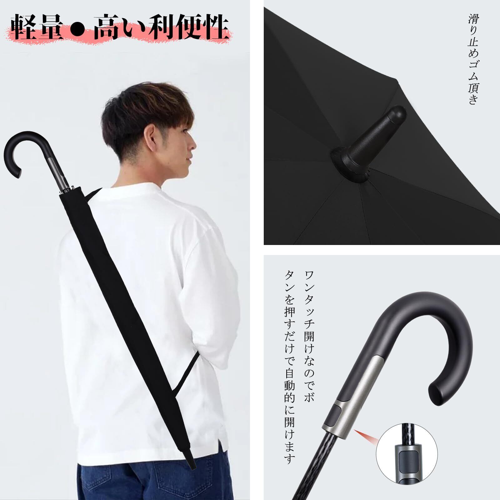 【豪雨&台風対抗の長傘】:わざわざ台風、暴風雨の天気の為に工夫を凝らして設計した耐強風の傘骨となります。強い風にあおられても心強くて安心できる男性専用の紳士傘です。傘骨は柔軟で丈夫なグラスファイバーを採用し、二重構造に出来上がったので今までに無い強度と耐久性を実現しました。かなり耐久性に優れ、暴風雨、台風の天候でも容易に割れたり折れたりする心配がありません。傘の部分が強風で裏返っても元に戻ります。安易に折れたり曲がったりする心配ありません。
