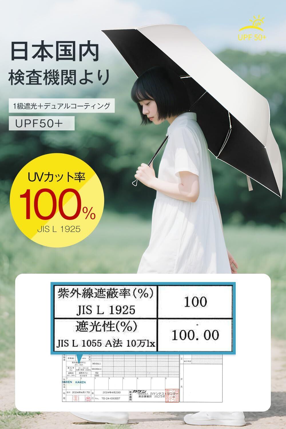 JIS認証を受けたこの日傘は、UVカット率100%・遮光率100%を誇ります。UPF50+の効率で、強い日差しからしっかりとお肌を守ります。暑さ対策や熱中症防止に理想的なアイテムとして、夏の必需品です。