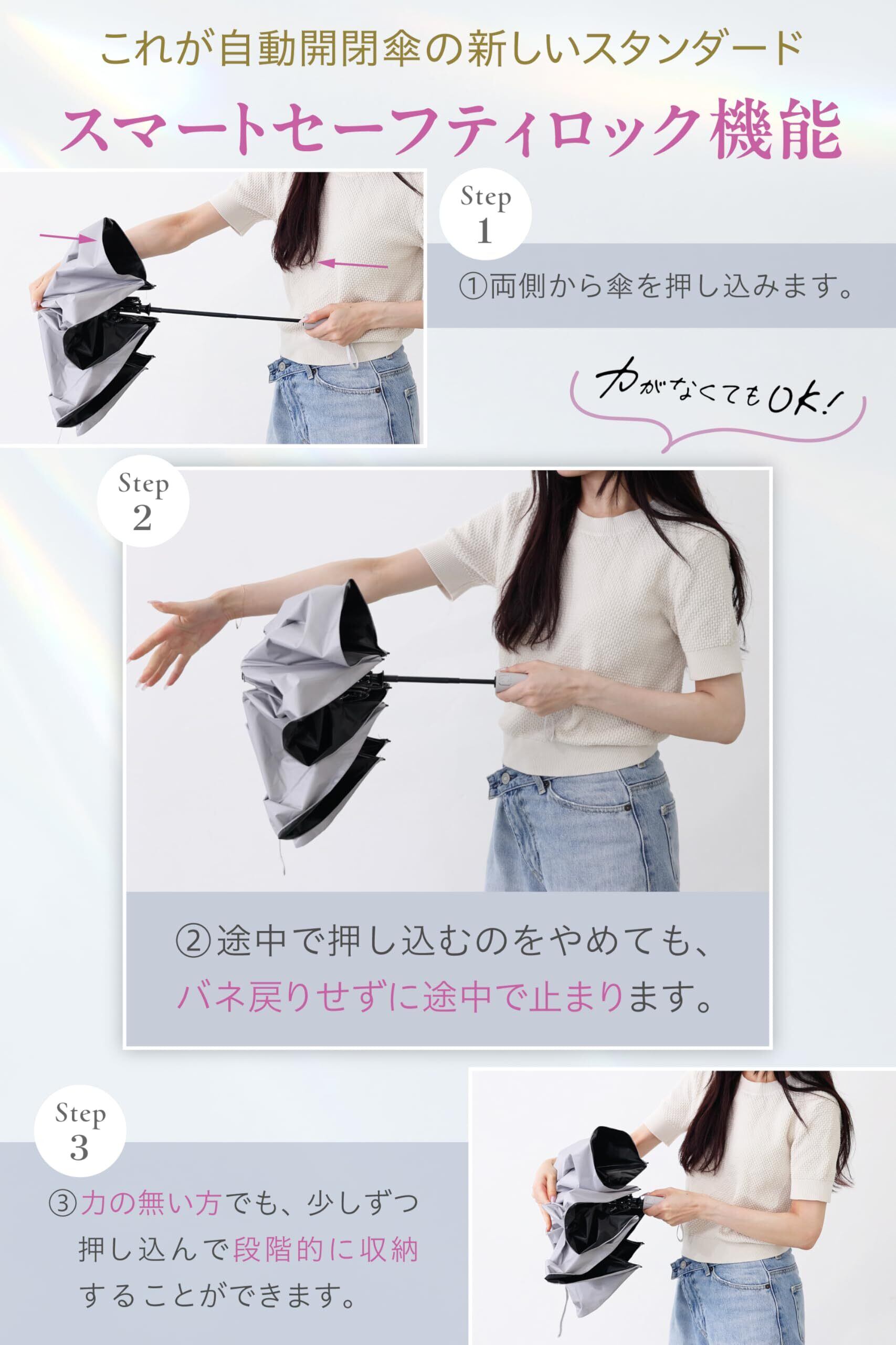安全性にも配慮し、スマートセーフティロック機能を搭載。高品質な設計により、風の強い日でも安心してご使用いただけます。耐久性も兼ね備えた傘で、長くご愛用いただけます。