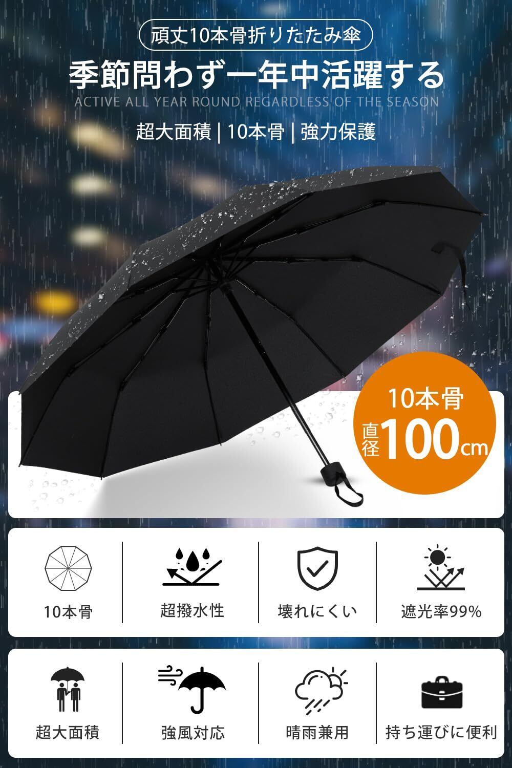 【大きいサイズ&頑丈の折りたたみ傘 軽量 メンズ】折り畳み傘の表面のアークの長さが114cmに達し、傘の直径が100cmに達しております。普通の折り畳み傘 メンズの直径が90cmしかありません。大雨·強風の日も安心の大きめサイズ!大人二人がすっぽり入ります。しかもシンプルなデザインを採用し、ビジネスカジュアルにも便利に合わせることができます。更に落ち着いた色もメンズに適します。また、頑丈な10本骨 折りたたみ傘です。 柔軟性と強度を併せ、耐風性と耐久性ともに向上させた折りたたみ傘です。 空気力学に基づいて風を受け流す構造で設計されているので、強い風でびっくり返っても元に戻ります。 また、コーティングを噴霧しているので錆びることは心配がありません。