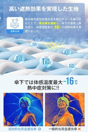 【紫外線対策も暑さ対策も叶える高機能傘 】第三者検査機関にてJIS規格試験を行い、遮光率&紫外線遮蔽率100%ということを証明しました。日焼け対策・紫外線対策として強い日差しから肌をしっかりと守れます。また、断熱素材「酸化チタン」を練り込んだ生地を使用し、遮熱性も抜群! 折りたたみ日傘を開いたら、傘下温度の上昇を大幅に抑え、最大体感温度-16℃の遮熱効果を実現しました暑い夏の暑さ対策・熱中症対策にもぜひおすすめ!