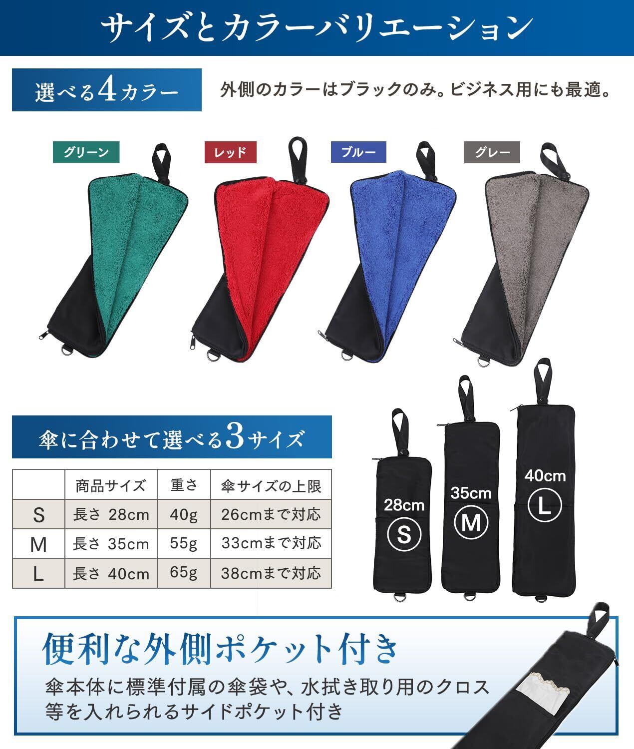 どんな折りたたみ傘にも対応する28/33/38cmのサイズ展開のある傘カバーです。中がマイクロファイバー製で、更に長さを当社過去の品より2倍にしてますので、傘に付着した水分をしっかり吸収します。傘のサイズに合わせて取っ手部分まで全て入るので傘から水が滴り落ちてくるという事もありません。