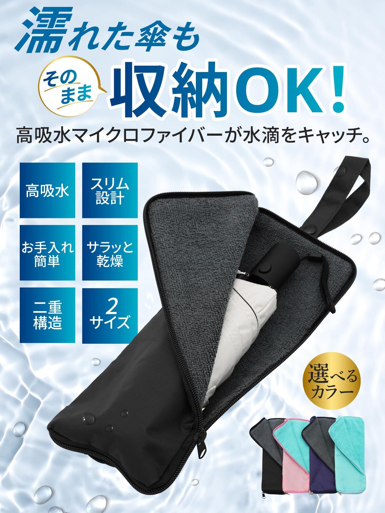 【中も外も濡れない2重構造】 内側は吸水、外側は撥水の2重構造で、傘の水が外に染み出す心配なし。バッグや衣類を守るだけでなく、カバー自体も扱いやすく快適です。