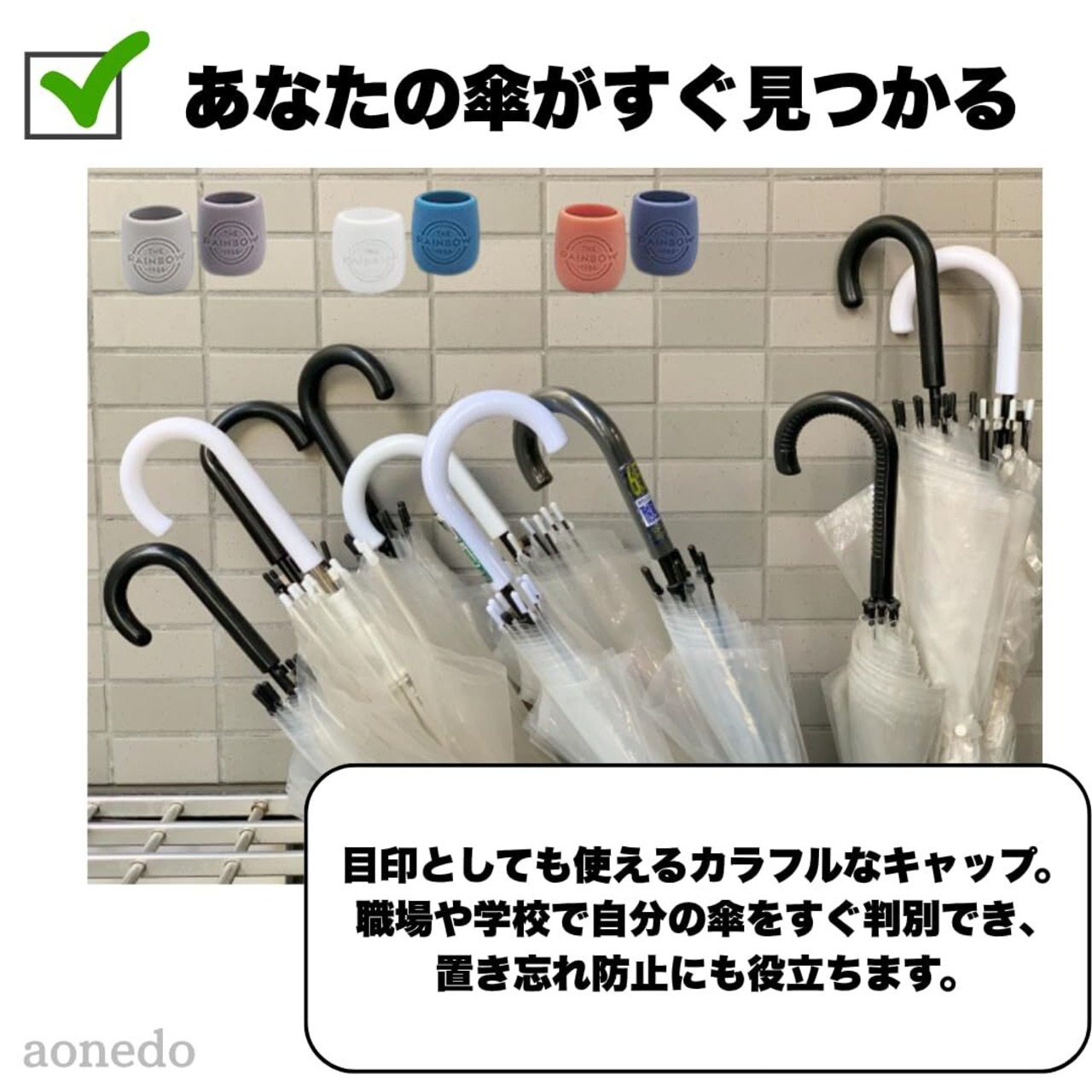 【雨の日も、あなたの傘がすぐ見つかる】 目印としても使えるカラフルなキャップ。職場や学校で自分の傘をすぐ判別でき、置き忘れ防止にも役立ちます。