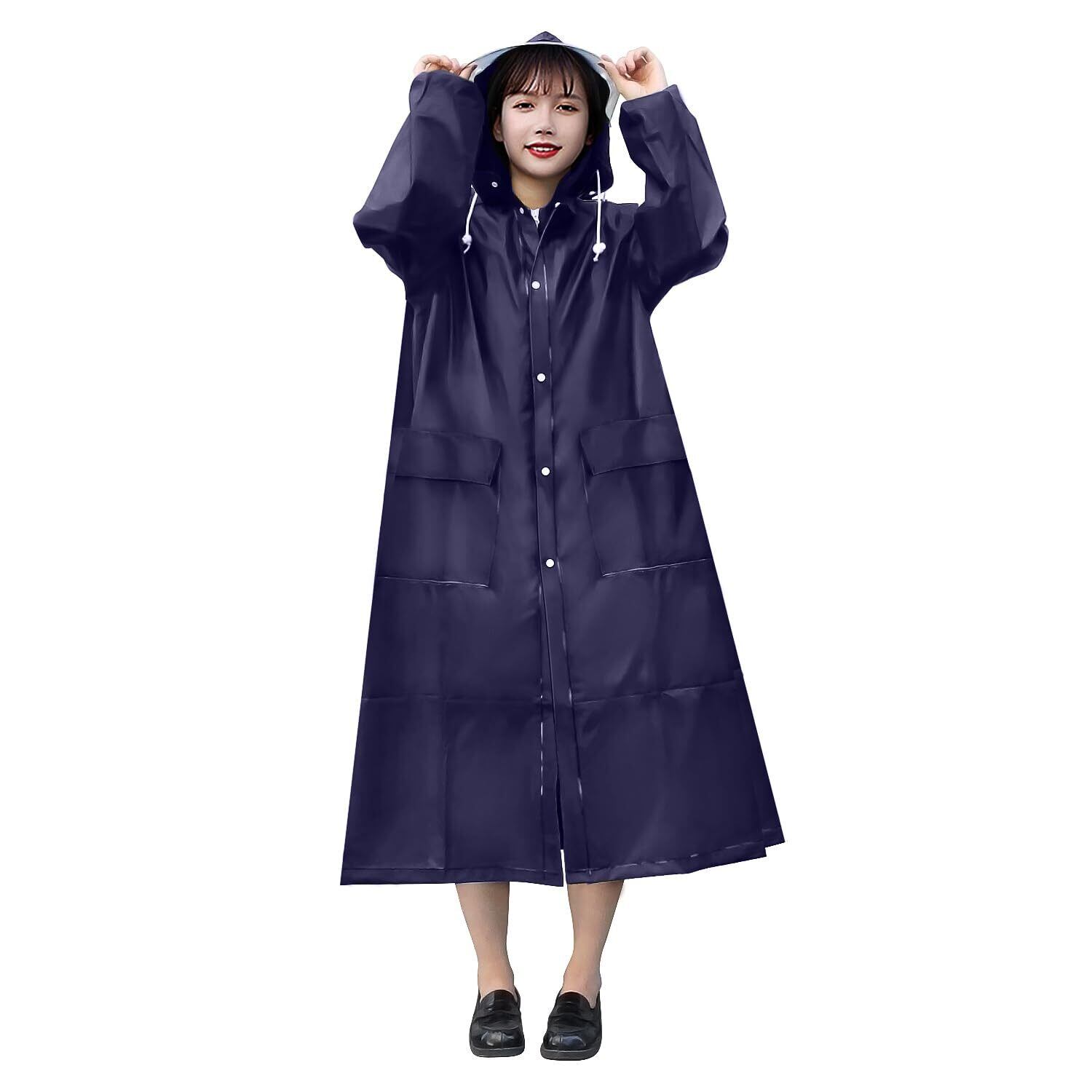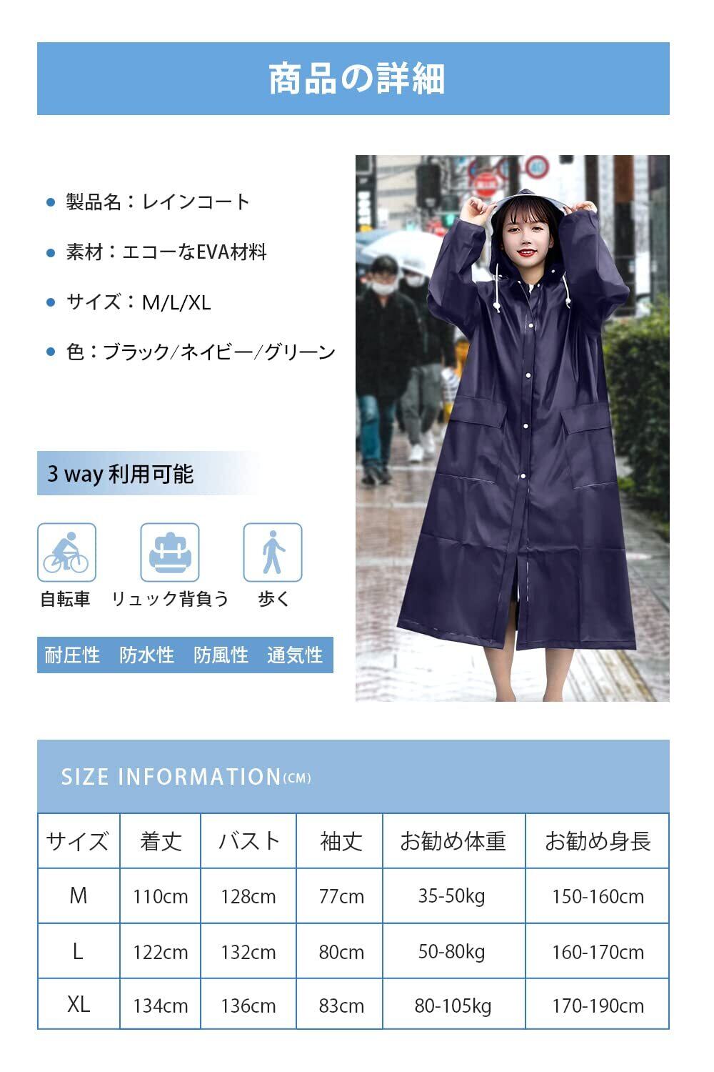 【男女兼用大きめサイズ】街歩きはもちろん、自転車、バイク、原付き運転にも対応可能なレインコートです。背中のスナップボタンを開けると、リュックを背負っても余裕に使える大きいサイズに広がり、膝下までカバーするロング丈に加え、体をすっぽり覆い、雨から守りながら、窮屈さがなく動きやすい。通勤通学に最適なレインポンチョで、台風対策、梅雨対策として大活躍。