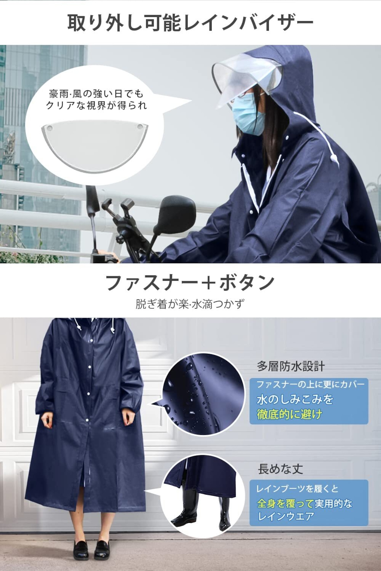 このレインコートは、徹底的に設計された二重の透明レインバイザーが特徴です。雨の日でも視界を妨げることなく、安全に自転車やバイクを運転できます。快適な移動を実現するスタイリッシュなデザインが魅力です。