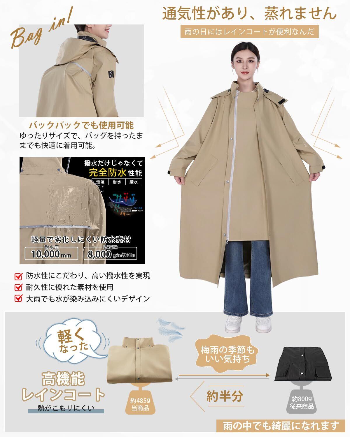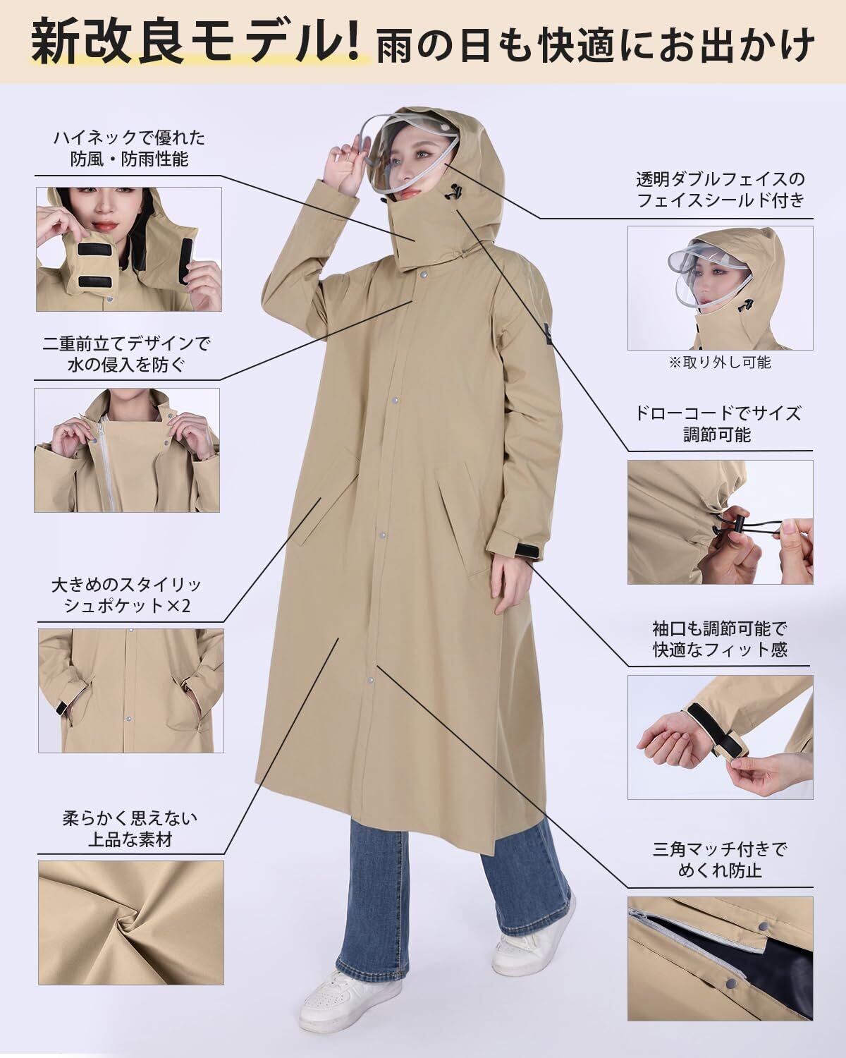 HINOKAZEの新作、晴れの日も雨の日も、あなたのスタイルを格上げする一着:1.高品質ポンジーを採用し、通気性に優れてムレにくく快適な着心地を実現。メッシュライナー付きで汗をかいてもベタつかず爽やか。TPUコーティングで防風・防水性もアップし、雨の日も快適なライディングをサポート。2.手の甲をしっかり守るカバー付きで濡れを防ぎ、自転車走行中も安心。3.着脱可能なフードと透明バイザーで顔をしっかりガードし、リュック対応デザインでアウトドアや通勤・通学にも最適なスタイリッシュレインコートです。