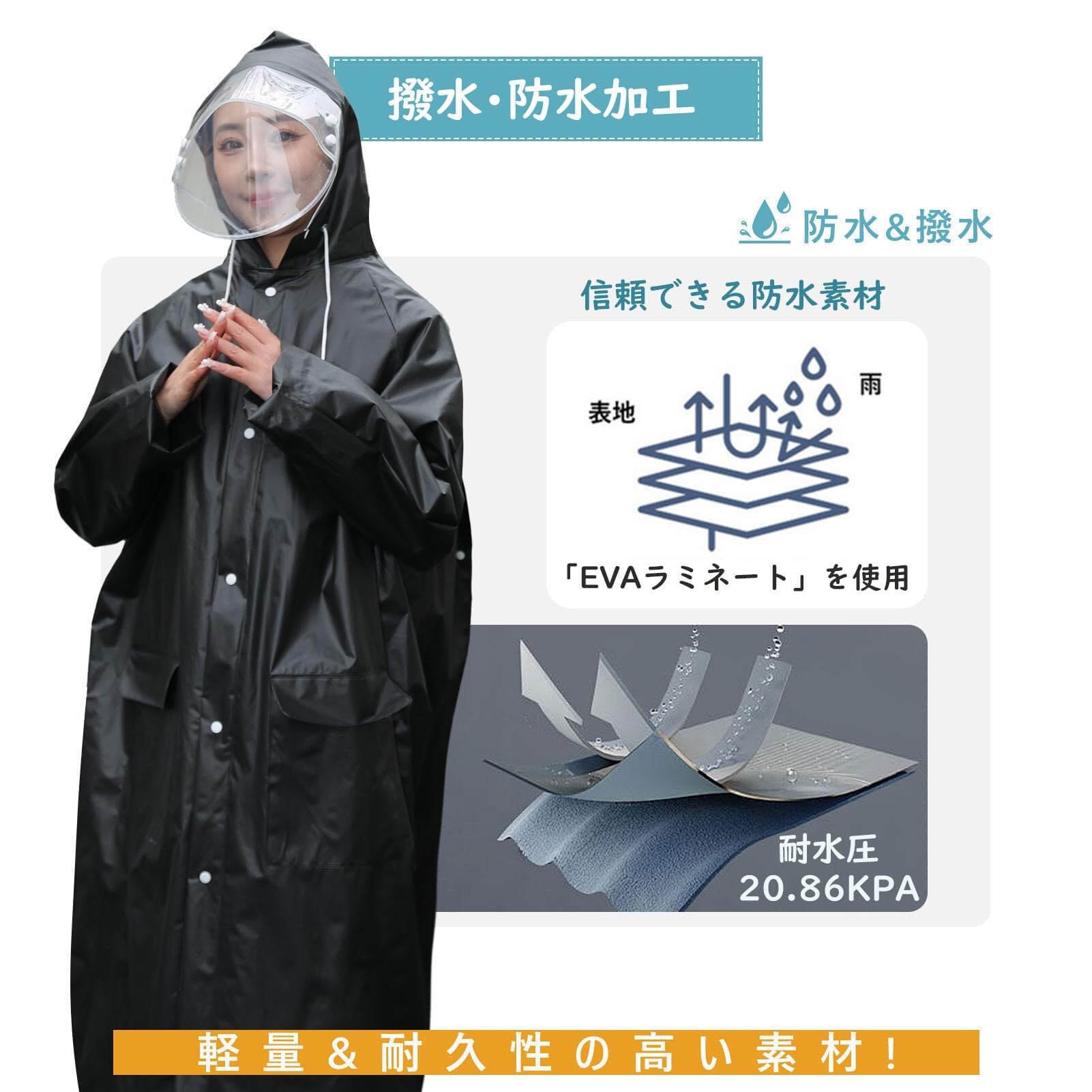 【強力撥水&防水加工&耐摩力が抜群】耐久性に優れたEVAラミネート素材を採用し、耐水圧2800mm、二重防水構造,傷がつきにくく、目に見える厚みがあり、ゴム臭がありません。防水性が高く丈夫で破れにく耐久性にも優れたレインコートです。 汚れの付きにくい撥水加工が施されているため、 通勤&通学&自転車&バイクなどの日常使いはもちろん、 キャンプや釣り、ハイキングなどのアウトドアまで幅広くご使用いただけます。