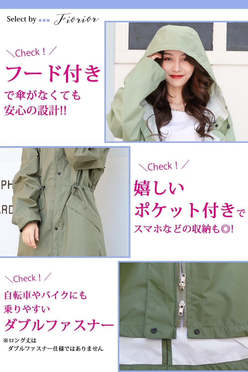 [Fiorior] \選べる着丈2種類/【膝丈/ロング丈】 レインコート おしゃれ レディース 通勤 通学 かわいい 撥水 防水 フード 自転車 バイク 梅雨 袋付き 【シルエットが可愛い】