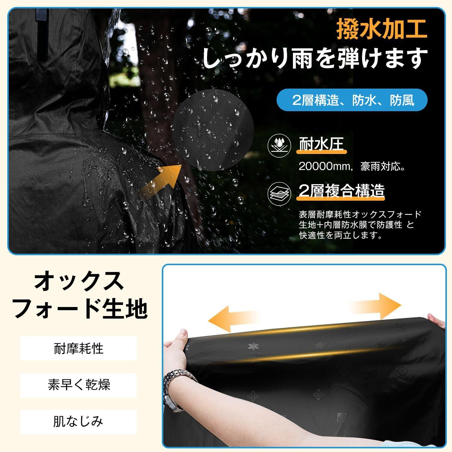 【20000mm防水耐磨素材】市場のレインコートと違って、弊店のレインコートは、20000mmの防水性能を持つ素材で作られており、豪雨でも内部に水が侵入するのを完全に防ぎます。高耐久性のオックスフォード布を使用しており、優れた耐摩耗性を備えているため、長期間の使用でもその性能を維持します。