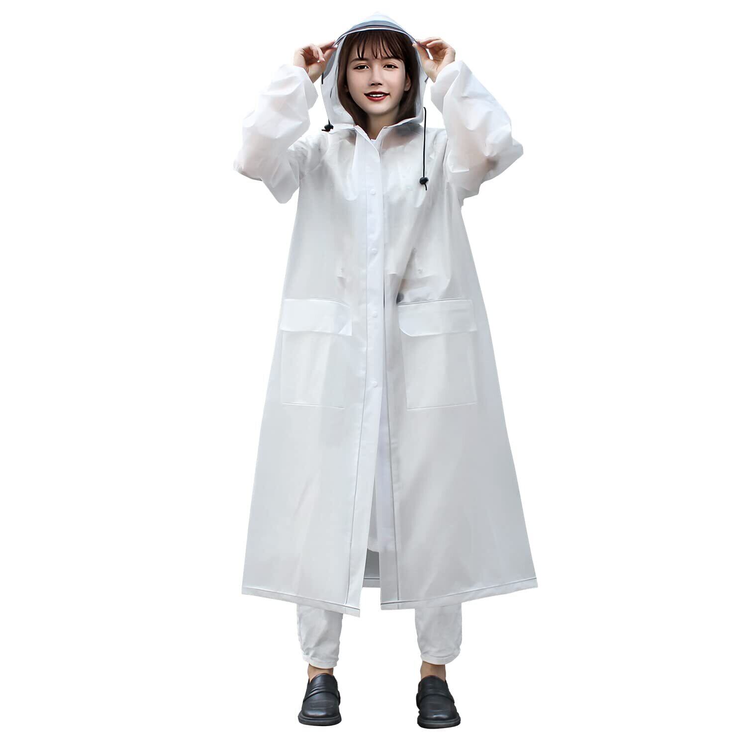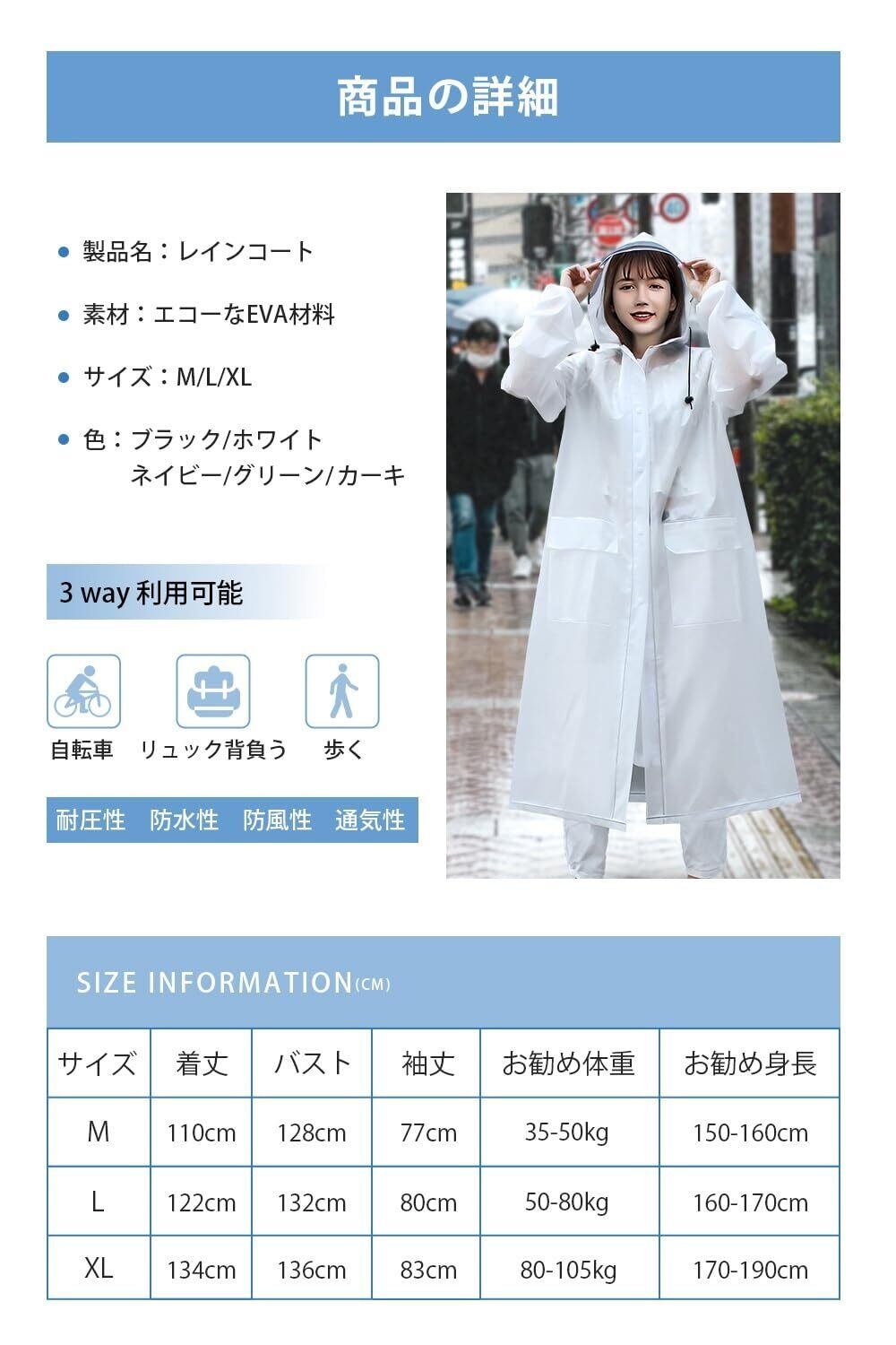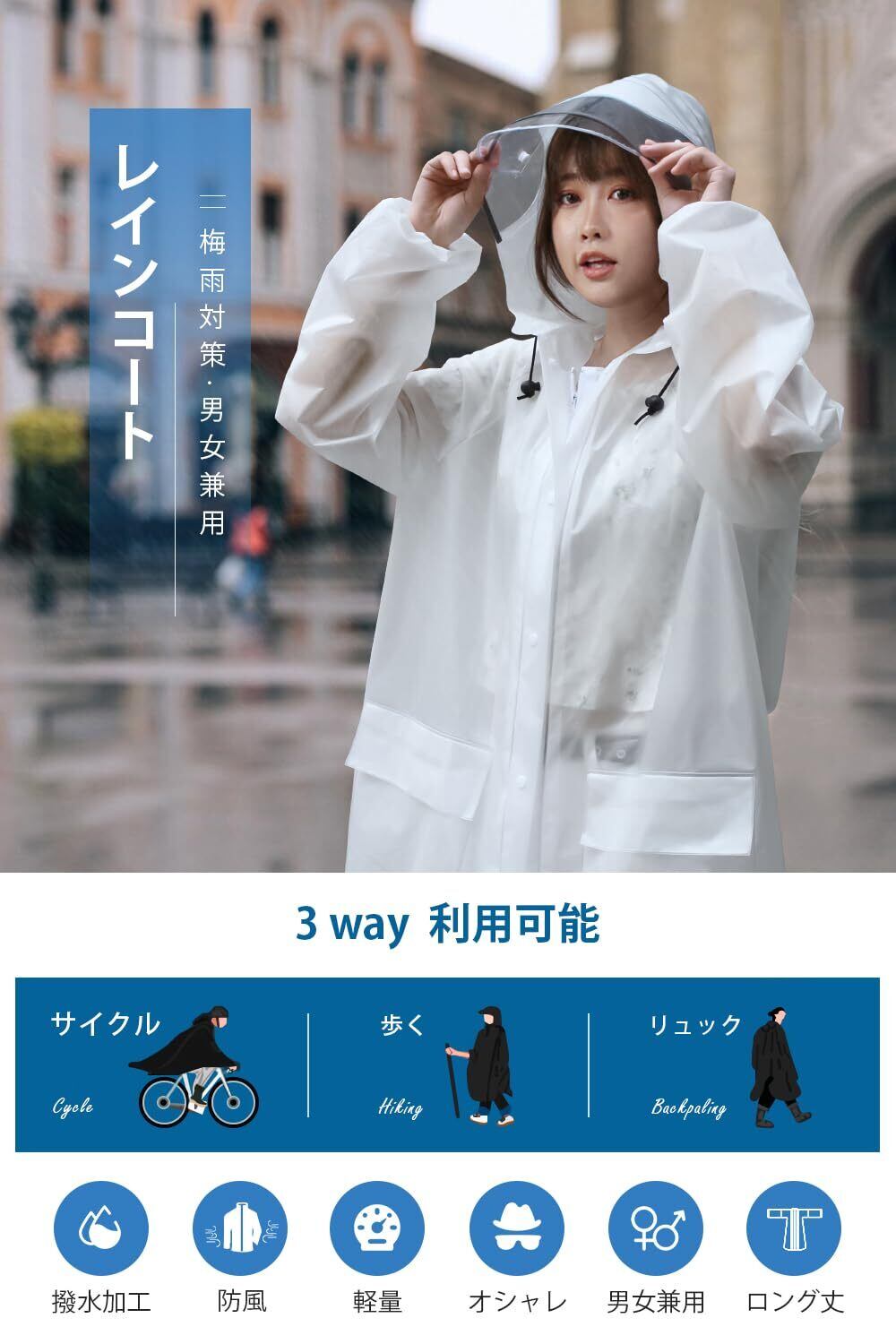 【強力撥水*防水耐久性が抜群】環境にやさしいEVA素材を使用し、三重撥水加工を施しており、雨の染み込みによる不快を軽減し、防水性が高く丈夫で破れにくく耐久性にも優れたレインコートです。耐水圧2500mm、大雨でも心配することなく、旅行やアウトドア、レジャーに安心使用できます。前開き仕様で防水ファスナーとスナップボタンを合わせる二重構造デザインなので、雨水や風の侵入を有効的に防げます。