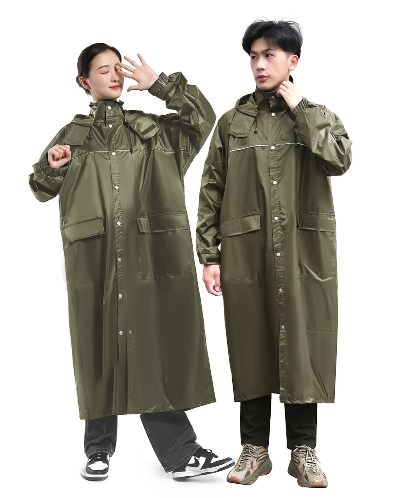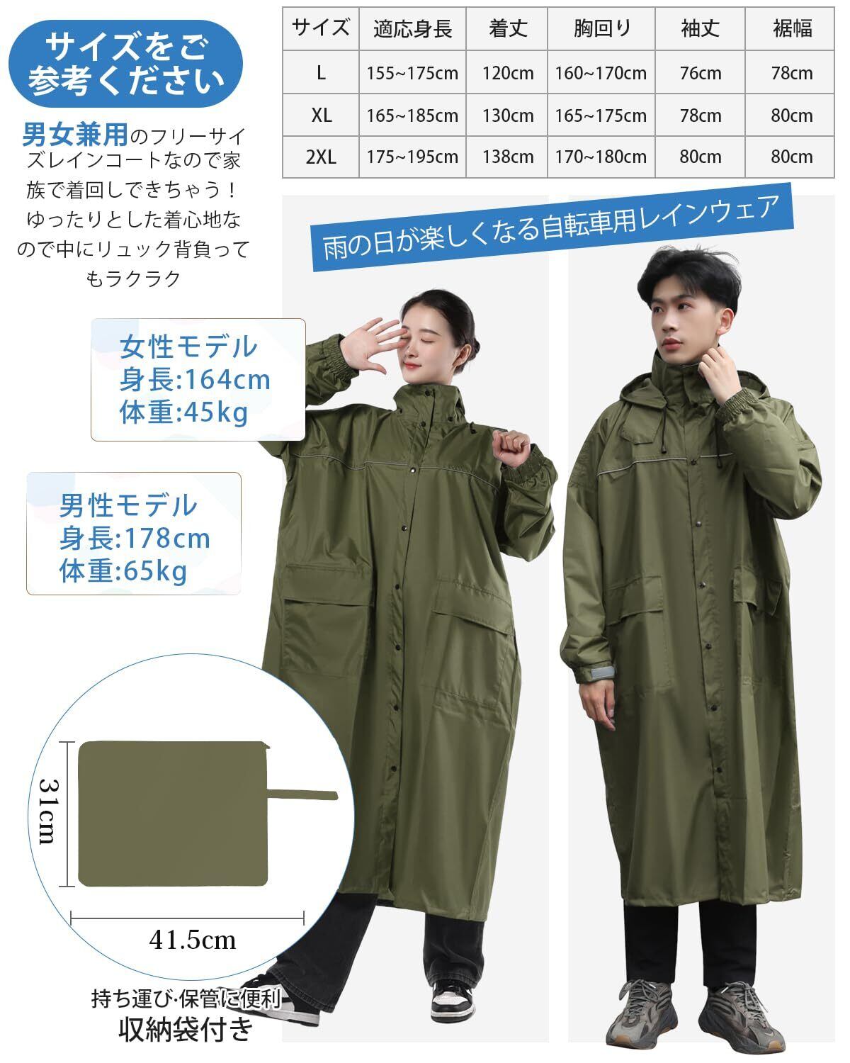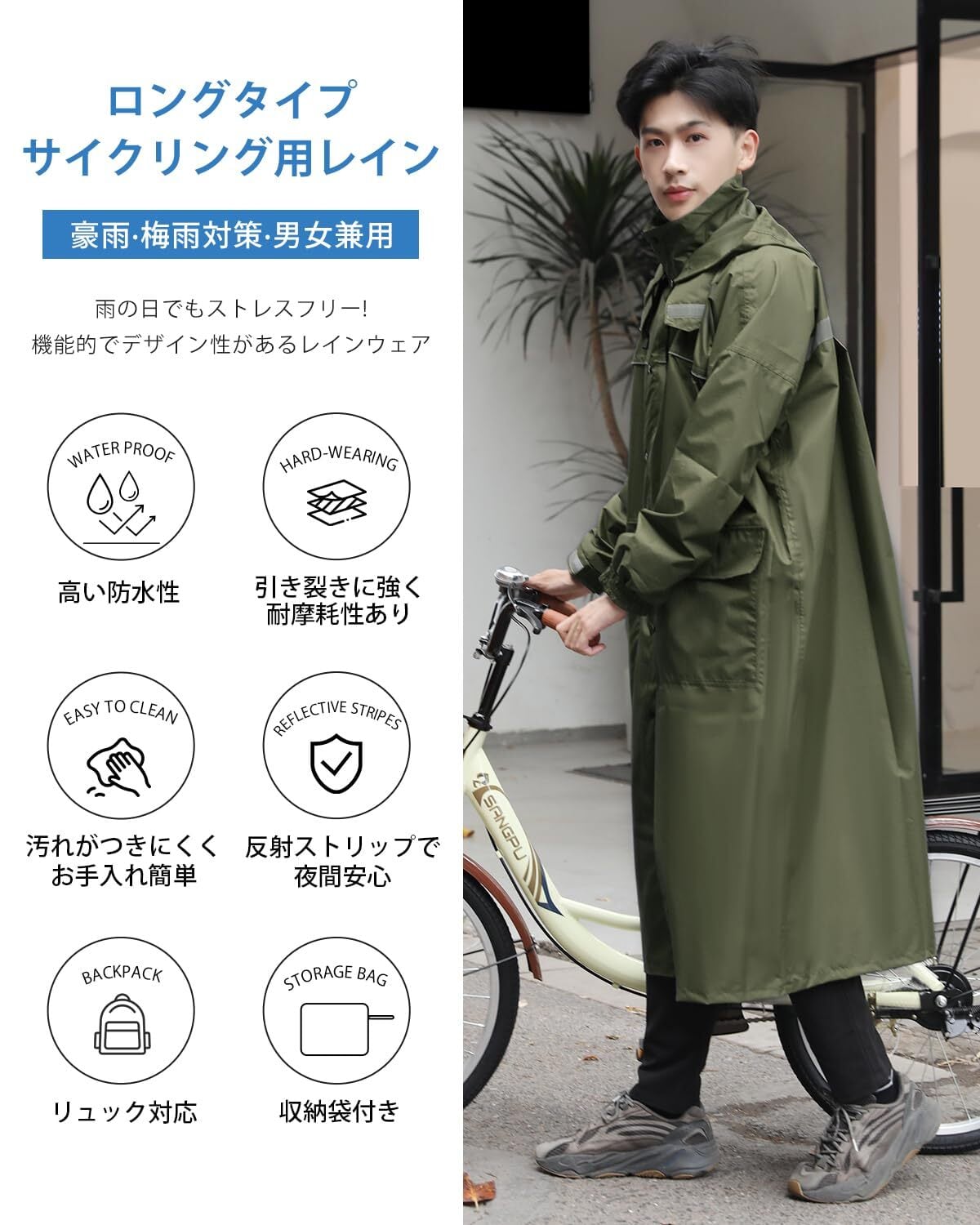 男女兼用デザインの長めの丈は、全身をしっかりとカバーし、リュックを背負っても安心して着用できます。通勤や通学、自転車、バイク利用時に最適なアイテムです。
