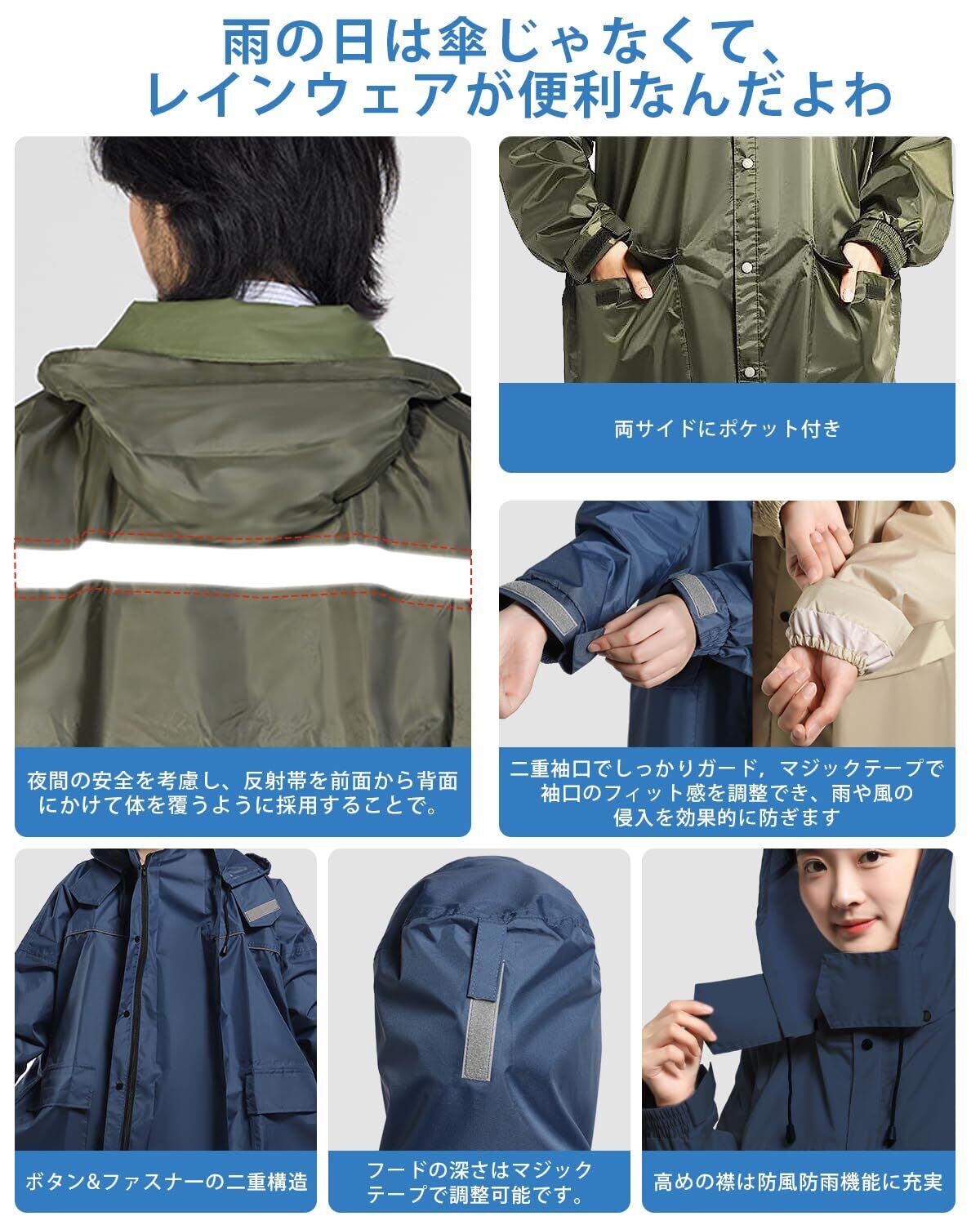 【最新版デザイン フードとバイザー(着脱可)】大人気!自転車 原付におすすめ!リュックを背負ったまま着れる!ロング丈登場!雨の日でも安心安全な機能たくさん:①16cm硬い二重つば:ツバは硬い素材で加工され、顔を覆ってなくて視界が良好です。②フードは取り外しが容易なスナップボタンを採用しており、必要に応じて取り付け?取り外しが可能です。③フードの深さをマジックテープで調整でき、最適な深さで固定可能です。④帽子の紐は帽子のサイズを調節する事ができて、入水を防止します。⑤前の部分に大きめのポケツトが2つついているから、ちょっとした小物を入れておくのに便利。⑥前身ごろには3角形のマチが付いているので、自転車をこいでいても足が濡れません。このマチがあることによってゆったりと自転車をこぐことができます。