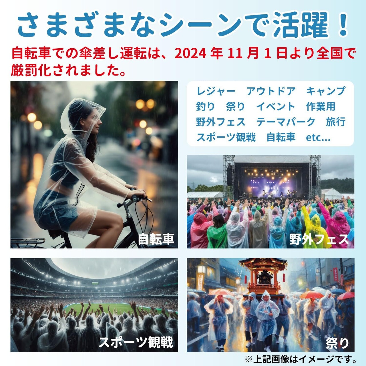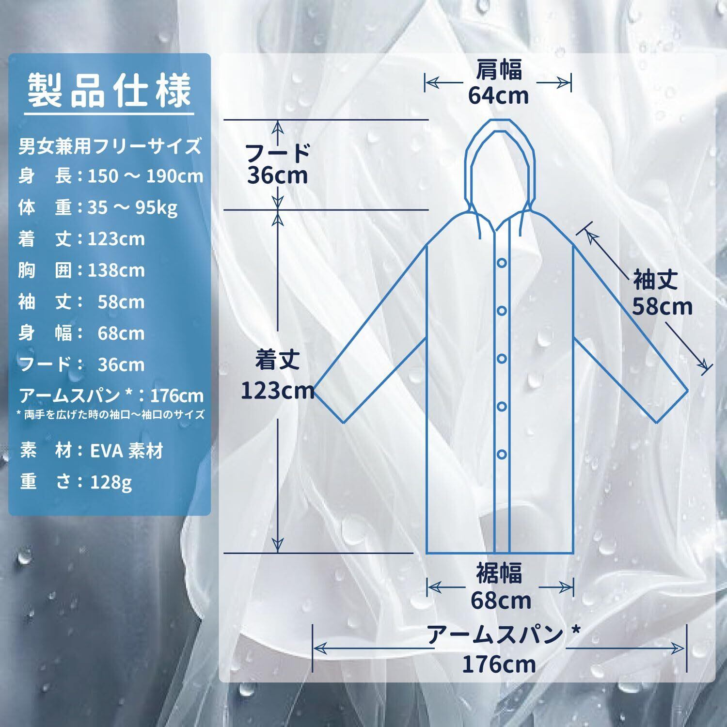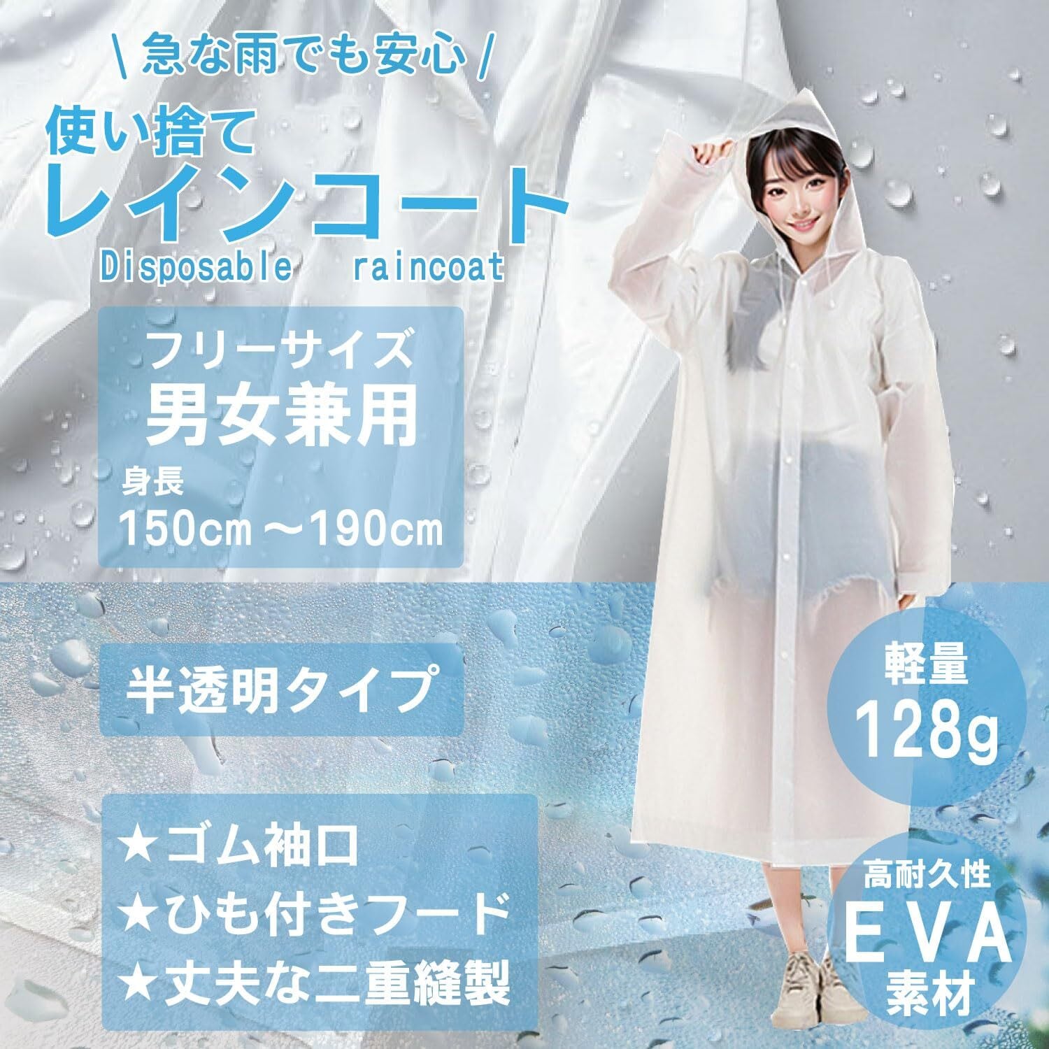 「この[Justart]の使い捨てレインコートで、雨の日も快適に過ごしましょう!」