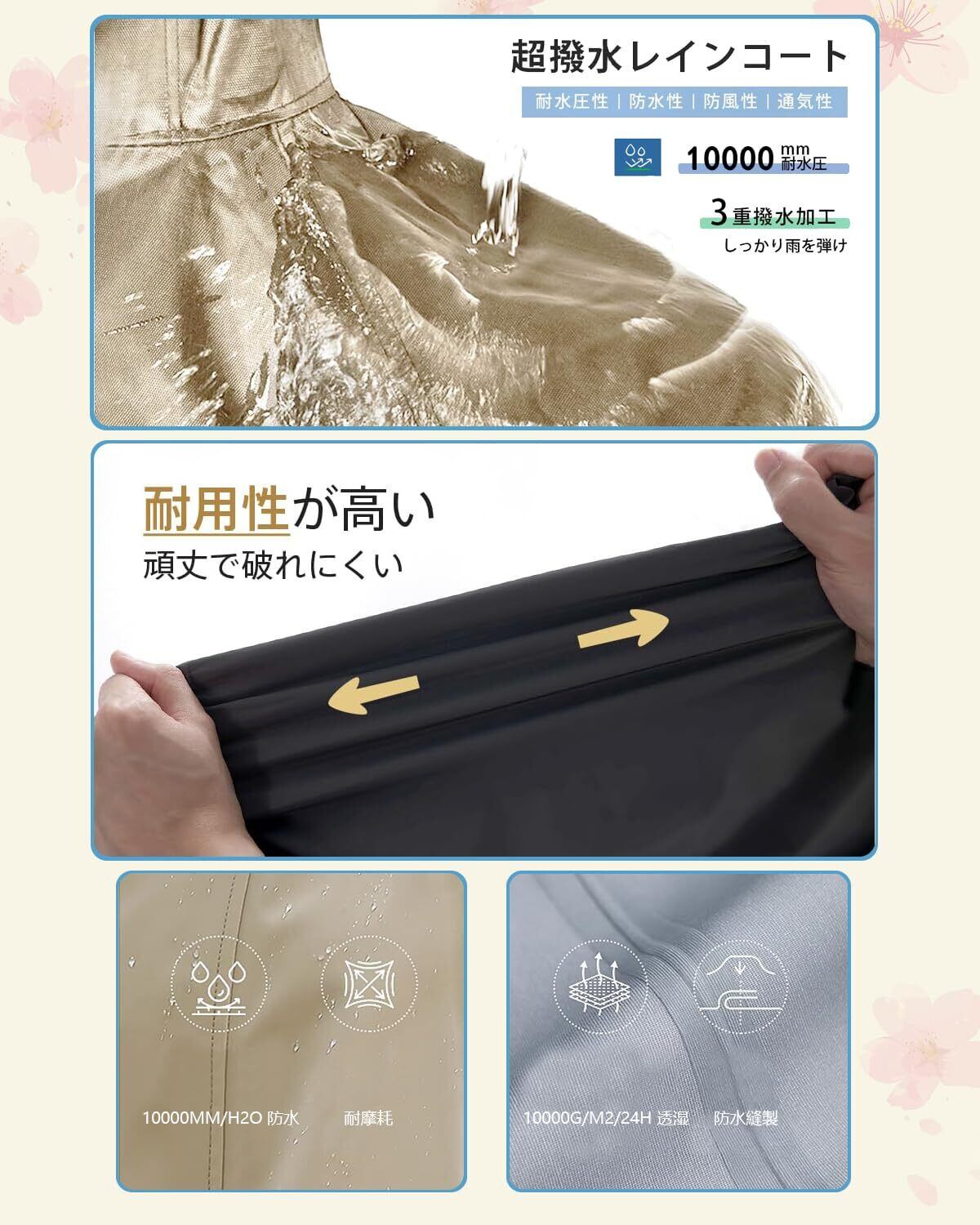耐水性に優れた素材を使用し、豪雨でもしっかりと体を守ります。防風機能を兼ね備えているため、強風の日でも快適な着心地を提供します。特に長時間の外出でも安心して着ることができます。