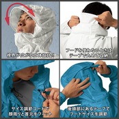 上着にはヘルメットにも対応したセーフティフードがついており、風の強い日でも快適に利用可能です。裾調整機能により、自分に合ったフィット感を実現し、動きやすさを追求したデザインです。