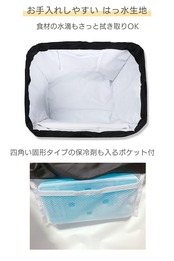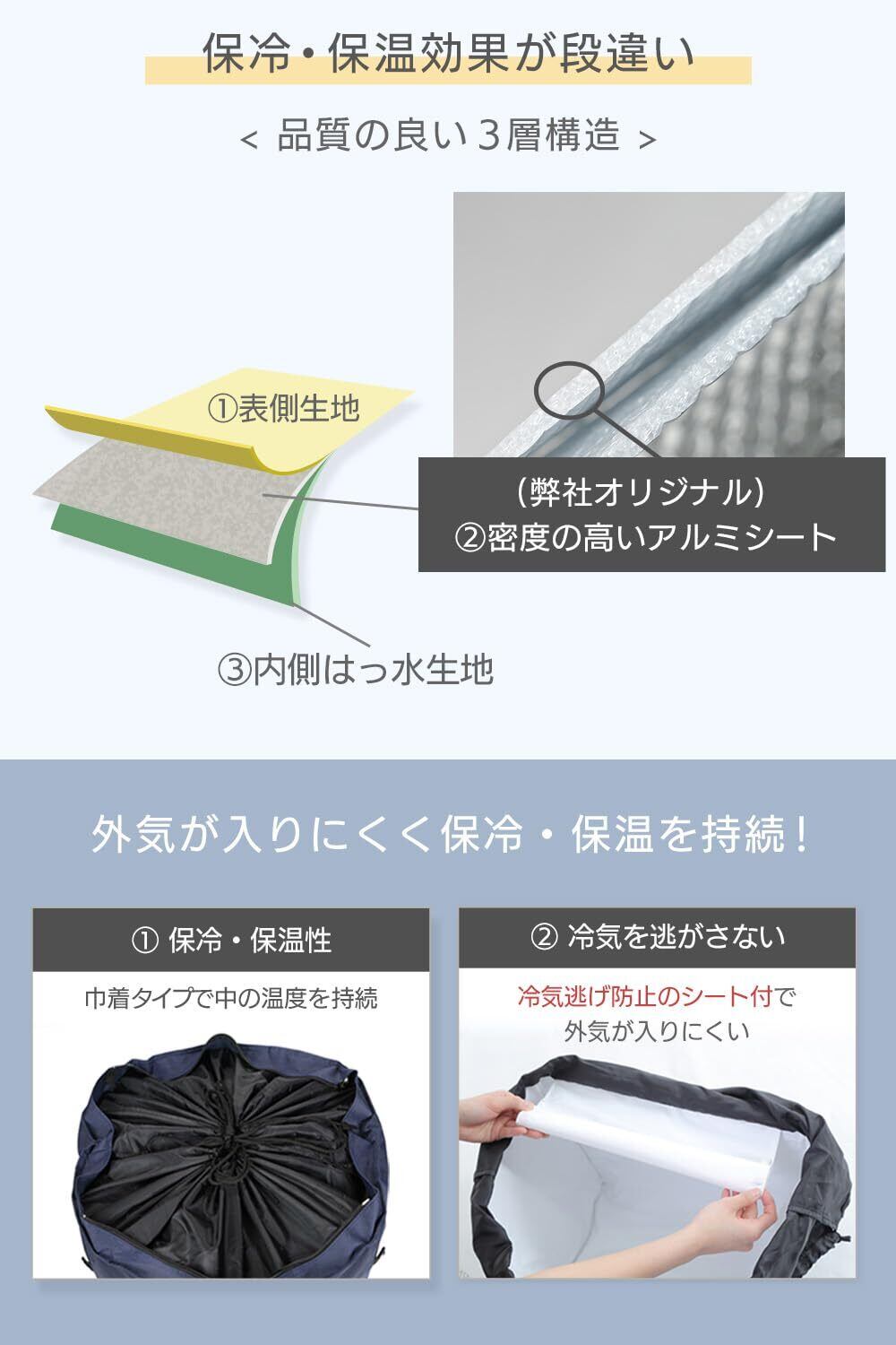 【保冷・保温性機能】巾着タイプで上部を絞ることができ、内側に付属している保冷シートをかぶせることで隙間から外気が入るのを防ぎ冷気や保温性を逃がしにくい構造に。 今までと比べると保冷・保温性が格段にアップしています。保冷シートは使わない時はコンパクトに収納できます。バッグの内側に保冷剤を入れるメッシュポケットが付いています。