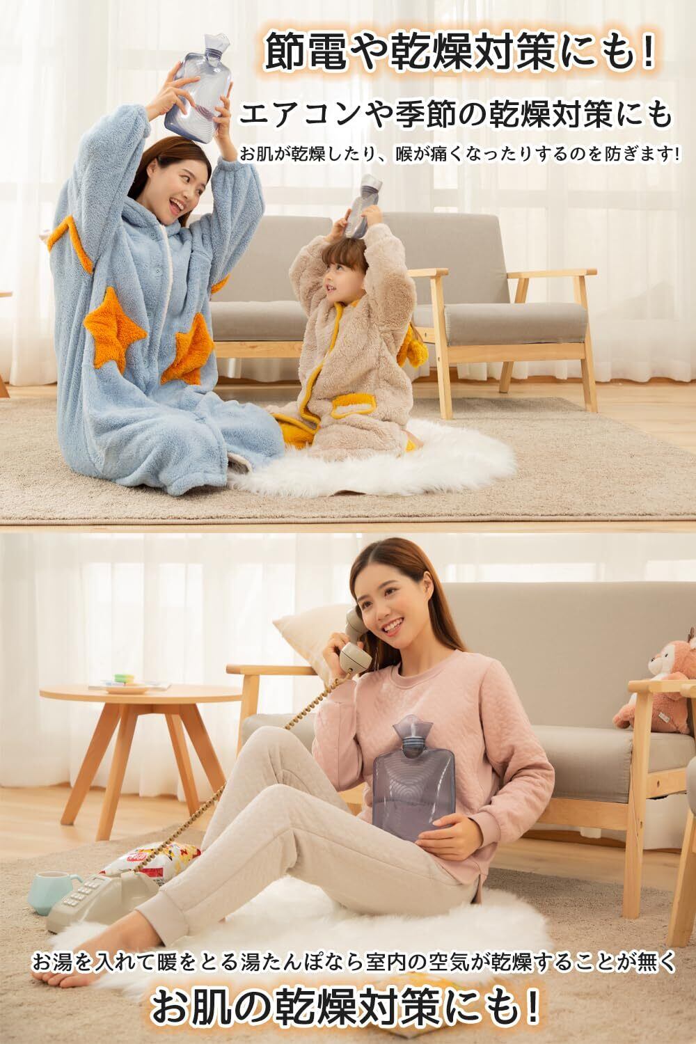 【節電や乾燥対策にも】エアコンや季節の乾燥対策にも湯たんぽが大活躍! エアコンでお肌が乾燥したり、喉が痛くなったりするのも湯たんぽで 暖かくすることでエアコンの利用を軽 減! 緊急災害時の停電などにもお湯を入れて暖をとれます。 柔らかいので折り畳んで防災バックに入れて置くことも可能です!