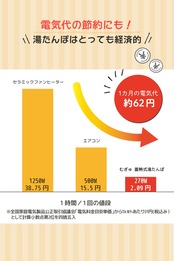 【他の暖房機器と比べてとってもエコ】1回の蓄熱電気代はたったの約2.09円! 蓄熱式湯たんぽ( 電気湯たんぽ )は、繰り返し使えるのでとっても経済的な暖房器具( エコ湯たんぽ )です。 また、充電後はコードレスなのでどこでも持ち運びが可能。 必要な所だけを温めることが出来るので、部屋全体を暖めるエアコンなどと違い環境にも優しいのが嬉しい湯たんぽです。