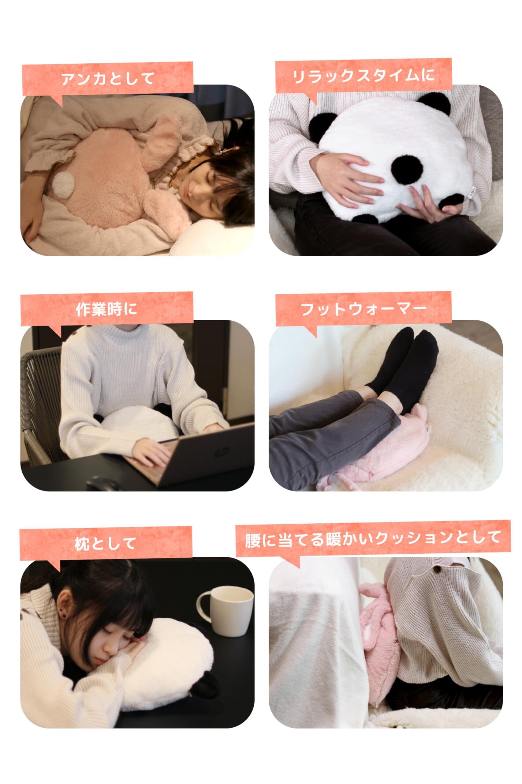 【可愛いおしり型の湯たんぽカバー】 ふわふわとして柔らかい肌触りで、ぎゅっと抱きしめたくなる触り心地の湯たんぽです。 うさぎとパンダをモチーフとした、キュートなしっぽや可愛い耳と足がポイントです。カバーは洗濯OKなので、汚れが気になった時には洗濯して清潔さを保てる湯たんぽ カバーです。