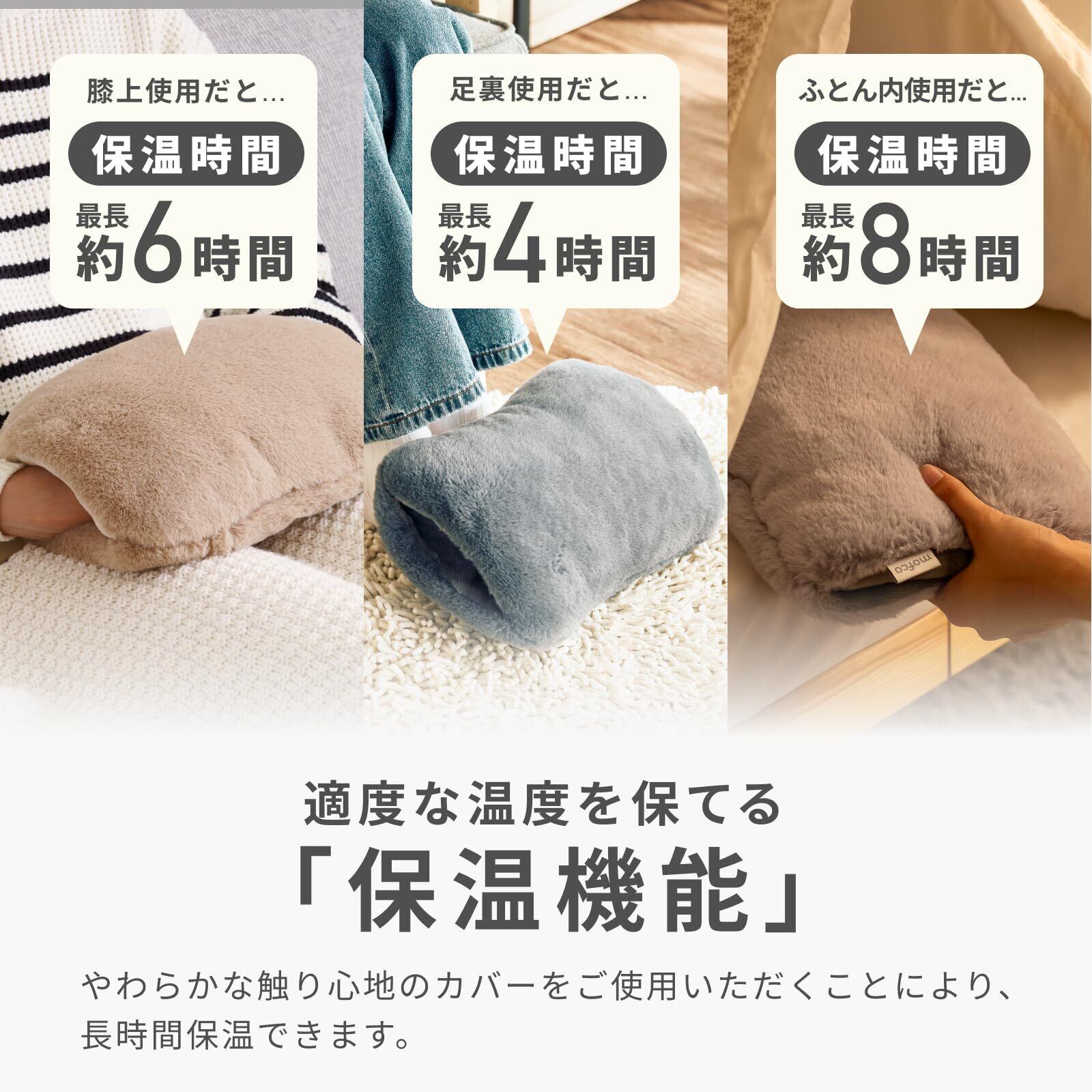 ■【面倒なお湯の交換が不要な蓄熱式】 電気で本体内部の水をあたためて蓄熱するため、面倒なお湯の交換が不要。約10分の蓄熱で最長約8時間あたたかさが持続し、 就寝時には朝までポカポカが続きます。 膝上使用:約6時間、足裏使用:約4時間、ふとん内使用:約8時間 蓄熱温度:約65℃(表面温度は約70℃)