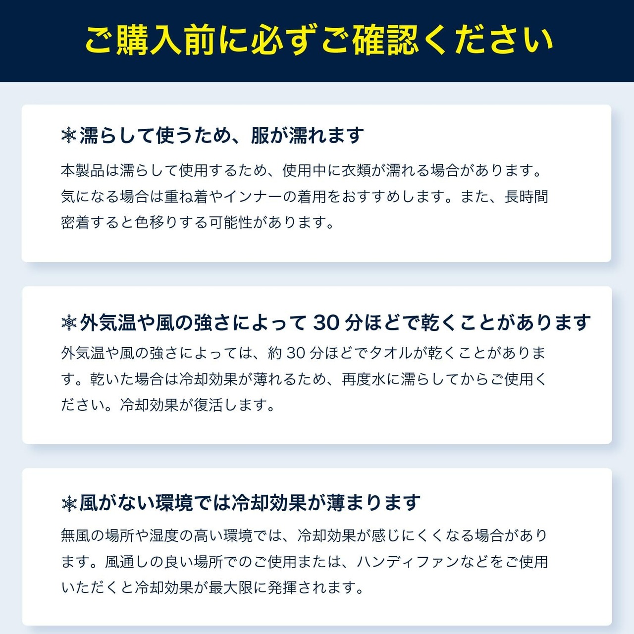 【瞬間冷却で最大-11℃の体感温度低下】 猛暑や炎天下でも涼しく快適に過ごせる冷感タオル。特殊冷却素材を採用し、水に濡らして軽く振るだけで体感温度を最大-11℃まで下げます。真夏のキャンプやフェス、スポーツ観戦、通勤・通学時の熱中症対策に最適。 【安心のノンホルムアルデヒド検査合格】 肌への優しさにもこだわったクールタオル。日本国内第三者機関にでノンホルムアルデヒド検査を実施し合格。お子様や敏感肌の方も安心して使用できます。有害物質フリーの安全設計で夏のレジャーや屋外作業、ガーデニングにも最適。家族みんなで共有していただけます。安心と快適さを両立した冷却タオルです。 【たった3ステップで何度でもひんやり】 使い方は簡単、①濡らす → ②軽く絞る → ③振る の3ステップで瞬間冷却。冷感タオルは何度でも冷却効果が復活するため、長時間の使用や連日のアウトドアでも活躍します。アイスタオルは水分と風で涼しさを生み出すので、電池は不要。繰り返し洗って使えるエコ仕様で、環境にもお財布にも優しい。フェスやキャンプ、ウォーキング、炎天下での作業時など、様々なシーンで頼れるクールタオルです。 【UVカット率97%で紫外線から守る】 夏の大敵、紫外線から肌を守るクールタオル。UVカット率97%の高性能素材で、強い日差しの中でも日焼けや肌ダメージをしっかり防ぎます。冷感効果とUVカット機能を併せ持つため、アウトドアやビーチ、プールサイド、フェスなどあらゆる夏イベントで大活躍。首や頭をしっかり保護、機能性と快適性を兼ね備えた夏の必須アイテムです。 【軽量&コンパクトで持ち運び便利】 冷感タオルは軽量設計で、コンパクトに折りたためばバッグやポーチにすっきり収納可能。持ち運びが簡単なので、出勤時の通勤バッグや旅行のスーツケースにも邪魔になりません。フェス、スポーツ観戦、キャンプ、ウォーキングなど、あらゆるシーンで活躍。アイスタオルは急な暑さ対策にも対応でき、使用後はそのまま洗って繰り返し利用できます。場所や季節を選ばず、涼しさと快適さを持ち歩ける冷却タオルです。